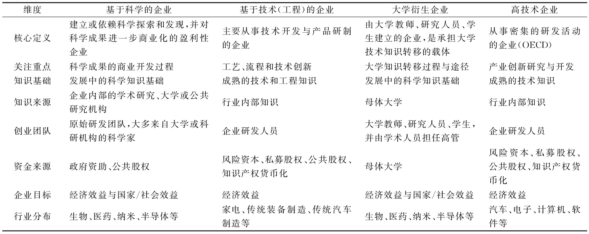 维度基于科学的企业基于技术(工程)的企业大学衍生企业高技术企业核心定义建立或依赖科学探索和发现,并对科学成果进一步商业化的盈利性企业主要从事技术开发与产品研制的企业由大学教师、研究人员、学生建立的企业,是承担大学技术知识转移的载体从事密集的研发活动的企业(OECD)关注重点科学成果的商业开发过程工艺、流程和技术创新大学知识转移过程与途径产业创新研究与开发知识基础发展中的科学知识基础成熟的技术和工程知识发展中的科学知识基础成熟的技术知识知识来源企业内部的学术研究、大学或公共研究机构行业内部知识母体大学行业内部知识创业团队原始研发团队,大多来自大学或科研机构的科学家企业研发人员大学教师、研究人员、学生,并由学术人员担任高管企业研发人员资金来源政府资助、公共股权风险资本、私募股权、公共股权、知识产权货币化母体大学风险资本、私募股权、公共股权、知识产权货币化企业目标经济效益与国家/社会效益经济效益经济效益与国家/社会效益经济效益行业分布生物、医药、纳米、半导体等家电、传统装备制造、传统汽车制造等生物、医药、纳米、半导体等汽车、电子、计算机、软件等