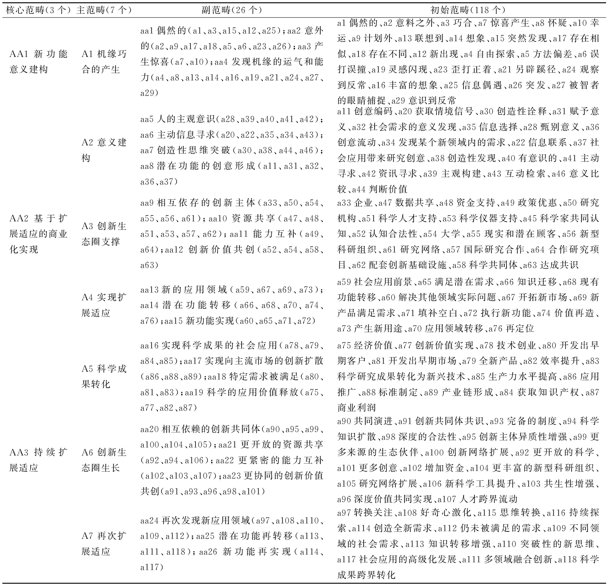 核心范畴(3个)主范畴(7个)副范畴(26个)初始范畴(118个)AA1新功能意义建构A1 机缘巧合的产生aa1偶然的(a1、a3、a15、a12、a25);aa2意外的(a2、a9、a17、a18、a5、a6、a23、a26);aa3产生惊喜(a7、a10);aa4发现机缘的运气和能力(a4、a8、a13、a14、a16、a19、a21、a24、a27、a29)a1偶然的、a2意料之外、a3巧合、a7惊喜产生、a8怀疑、a10幸运、a9计划外、a13联想到、a14想象、a15突然发现、a17存在相似、a18存在不同、a12新出现、a4自由探索、a5方法偏差、a6误打误撞、a19灵感闪现、a23歪打正着、a21另辟蹊径、a24观察到反常、a16丰富的想象、a25信息偶遇、a26突发、a27被智者的眼睛捕捉、a29意识到反常A2 意义建构aa5人的主观意识(a28、a39、a40、a41、a42);aa6主动信息寻求(a20、a22、a35、a34、a43);aa7创造性思维突破(a30、a38、a44、a46);aa8潜在功能的创意形成(a11、a31、a32、a36、a37)a11创意编码、a20获取情境信号、a30创造性诠释、a31赋予意义、a32社会需求的意义发现、a35信息选择、a28甄别意义、a36创意流动、a34发现某个新领域内的需求、a22信息联系、a37社会应用带来研究创意、a38创造性发现、a40有意识的、a41主动寻求、a42资讯寻求、a39主观构建、a43互动检索、a46意义比较、a44判断价值AA2基于扩展适应的商业化实现A3 创新生态圈支撑aa9相互依存的创新主体(a33、a50、a54、a55、a56、a61);aa10资源共享(a47、a48、a51、a53、a57、a62);aa11能力互补(a49、a64);aa12创新价值共创(a52、a54、a58、a63)a33企业、a47数据共享、a48资金支持、a49政策优惠、a50研究机构、a51科学人才支持、a53科学仪器支持、a45科学家共同认知、a52认知合法性、a54大学、a55现实和潜在顾客、a56新型科研组织、a61研究网络、a57国际研究合作、a64合作研究项目、a62配套创新基础设施、a58科学共同体、a63达成共识A4 实现扩展适应aa13新的应用领域(a59、a67、a69、a73);aa14潜在功能转移(a66、a68、a70、a74、a76);aa15新功能实现(a60、a65、a71、a72)a59社会应用前景、a65满足潜在需求、a66知识迁移、a68现有功能转移、a60解决其他领域实际问题、a67开拓新市场、a69新产品满足需求、a71填补空白、a72执行新功能、a74价值再造、a73产生新用途、a70应用领域转移、a76再定位A5 科学成果转化aa16实现科学成果的社会应用(a78、a79、a84、a85);aa17实现向主流市场的创新扩散(a86、a88、a89);aa18特定需求被满足(a80、a81、a83);aa19科学的应用价值释放(a75、a77、a82、a87)a75经济价值、a77创新价值实现、a78技术创业、a80开发出早期客户、a81开发出早期市场、a79全新产品、a82效率提升、a83科学研究成果转化为新兴技术、a85生产力水平提高、a86应用推广、a88标准制定、a89产业链形成、a84获取知识产权、a87商业利润AA3持续扩展适应A6 创新生态圈生长aa20相互依赖的创新共同体(a90、a95、a99、a100、a104、a105);aa21更开放的资源共享(a92、a94、a106);aa22更紧密的能力互补(a102、a103、a107);aa23更协同的创新价值共创(a91、a93、a96、a98、a101)a90共同演进、a91创新共同体共识、a93完备的制度、a94科学知识扩散、a98深度的合法性、a95创新主体异质性增强、a99更多来源的生态伙伴、a100创新网络扩展、a92更开放的科学、a101更多创意、a102增加资金、a104更丰富的新型科研组织、a105研究网络扩展、a106新科学工具提升、a103共生性增强、a96深度价值共同实现、a107人才跨界流动A7 再次扩展适应aa24再次发现新应用领域(a97、a108、a110、a109、a112);aa25潜在功能再转移(a113、a111、a118);aa26新功能再实现(a114、a117)a97转换关注、a108好奇心激化、a115思维转换、a116持续探索、a114创造全新需求、a112仍未被满足的需求、a109不同领域的社会需求、a113知识转移增强、a110突破性的新思维、a117社会应用的高级化发展、a111多领域融合创新、a118科学成果跨界转化