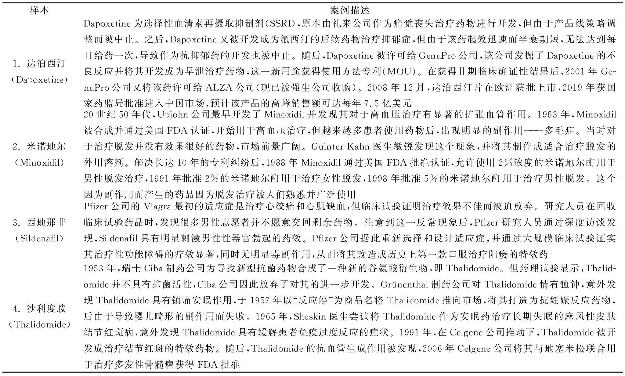 样本案例描述1. 达泊西汀(Dapoxetine)Dapoxetine为选择性血清素再摄取抑制剂(SSRI),原本由礼来公司作为痛觉丧失治疗药物进行开发,但由于产品线策略调整而被中止。之后,Dapoxetine又被开发成为氟西汀的后续药物治疗抑郁症,但由于该药起效迅速而半衰期短,无法达到每日给药一次,导致作为抗抑郁药的开发也被中止。随后,Dapoxetine被许可给GenuPro公司,该公司发掘了Dapoxetine的不良反应并将其开发成为早泄治疗药物,这一新用途获得使用方法专利(MOU)。在获得Ⅱ期临床确证性结果后,2001年Ge-nuPro公司又将该药许可给ALZA公司(现已被强生公司收购)。2008年12月,达泊西汀片在欧洲获批上市,2019年获国家药监局批准进入中国市场,预计该产品的高峰销售额可达每年7.5亿美元2. 米诺地尔 (Minoxidil)20世纪50年代,Upjohn公司最早开发了Minoxidil并发现其对于高血压治疗有显著的扩张血管作用。1963年,Minoxidil被合成并通过美国FDA认证,开始用于高血压治疗,但越来越多患者使用药物后,出现明显的副作用———多毛症。当时对于治疗脱发并没有效果很好的药物,市场前景广阔。Guinter Kahn医生敏锐发现这个现象,并将其制作成适合治疗脱发的外用溶剂。解决长达10年的专利纠纷后,1988年Minoxidil通过美国FDA批准认证,允许使用2%浓度的米诺地尔酊用于男性脱发治疗,1991年批准2%的米诺地尔酊用于治疗女性脱发,1998年批准5%的米诺地尔酊用于治疗男性脱发。这个因为副作用而产生的药品因为脱发治疗被人们熟悉并广泛使用3. 西地那非 (Sildenafil)Pfizer公司的Viagra最初的适应症是治疗心绞痛和心肌缺血,但临床试验证明治疗效果不佳而被迫放弃。研究人员在回收临床试验药品时,发现很多男性志愿者并不愿意交回剩余药物。注意到这一反常现象后,Pfizer研究人员通过深度访谈发现,Sildenafil具有明显刺激男性性器官勃起的药效。Pfizer公司据此重新选择和设计适应症,并通过大规模临床试验证实其治疗性功能障碍的疗效显著,同时无明显毒副作用,从而将其改造成历史上第一款口服治疗阳痿的特效药4. 沙利度胺(Thalidomide)1953年,瑞士Ciba制药公司为寻找新型抗菌药物合成了一种新的谷氨酸衍生物,即Thalidomide。但药理试验显示,Thalid-omide并不具有抑菌活性,Ciba公司因此放弃了对其的进一步开发。Grünenthal制药公司对Thalidomide情有独钟,意外发现Thalidomide具有镇痛安眠作用,于1957年以“反应停”为商品名将Thalidomide推向市场,将其打造为抗妊娠反应药物,后由于导致婴儿畸形的副作用而失败。1965年,Sheskin医生尝试将Thalidomide作为安眠药治疗长期失眠的麻风性皮肤结节红斑病,意外发现Thalidomide具有缓解患者免疫过度反应的症状。1991年,在Celgene公司推动下,Thalidomide被开发成治疗结节红斑的特效药物。随后,Thalidomide的抗血管生成作用被发现,2006年Celgene公司将其与地塞米松联合用于治疗多发性骨髓瘤获得FDA批准