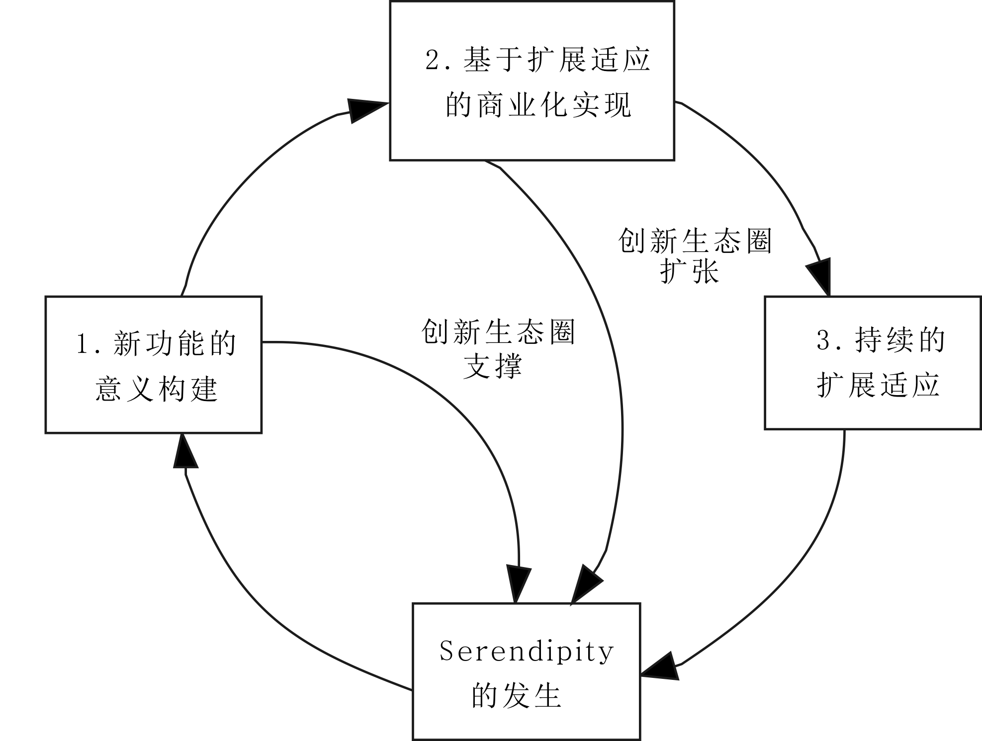根据Solo[17]的两步论观点,新思想来源及以后的实现与发展是技术创新成立的两个基本条件。技术的扩展适应以发现技术所具有某些意想不到功能的可用性为主要特征[18]。机缘巧合(Serendipity)演变为扩展适应的过程中走向结构化,功能转变、非预期或偶然性事件带来的转向都可以视为扩展适应,这相当于为技术创新提供了新思想来源。技术创新的实现又可抽象理解为现有技术的潜在功能(意想不到的功能)在新情境中的应用[16],这属于商业化执行的范畴,相当于技术创新中新思想来源形成之后的实现与发展。可见,现有文献指明了扩展适应具有驱动创新的重要意义,但是多数研究主要聚焦技术扩展适应和基于技术的创新领域,对扩展适应在基于科学的创新领域的作用和价值尚未引起充分重视。