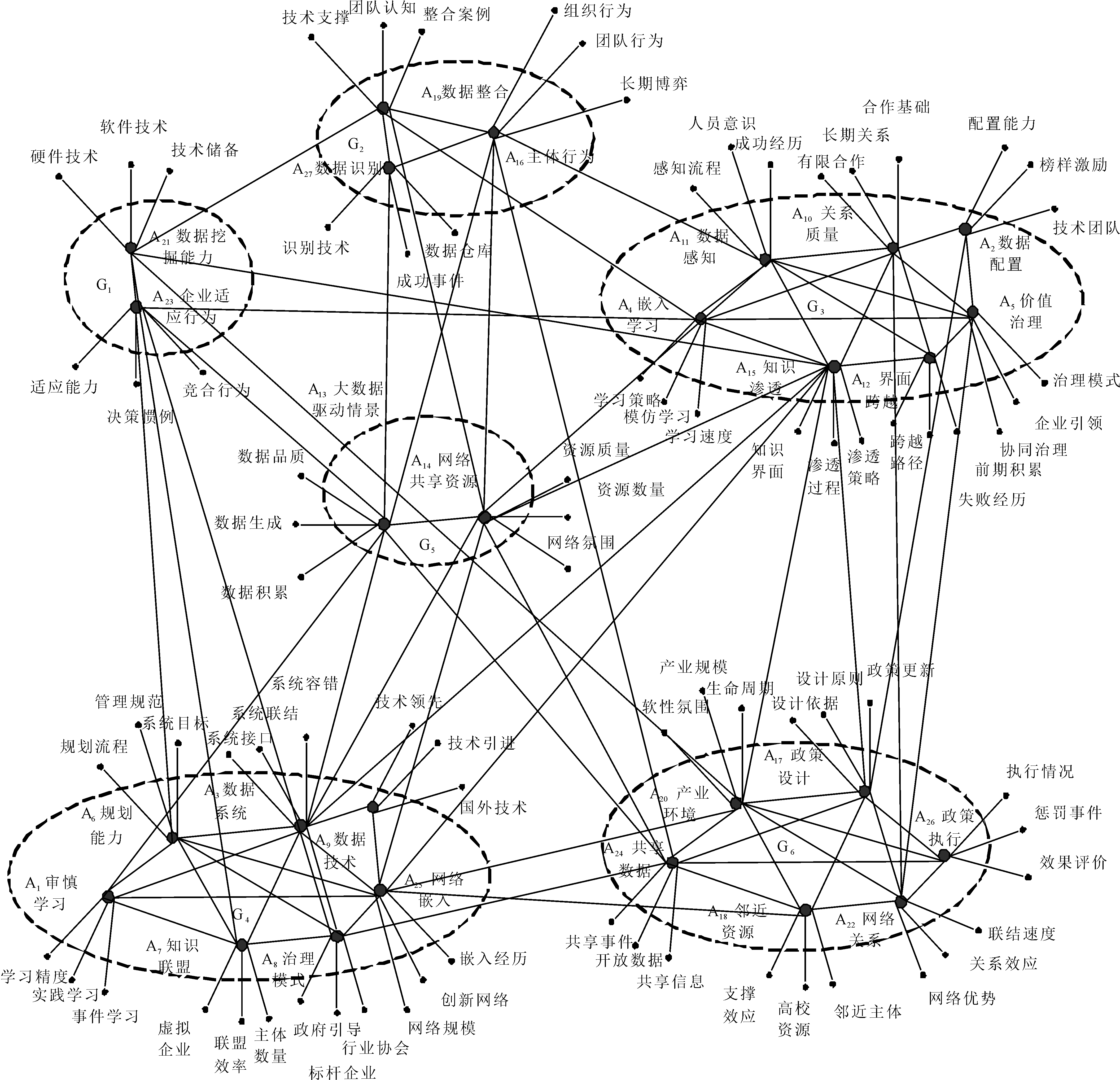 各范畴编号为:A1审慎学习、A2数据配置、A3数据系统、A4嵌入学习、A5价值治理、A6规划能力、A7知识联盟、A8治理模式、A9数据技术、A10关系质量、A11数据感知、A12界面跨越、A13数据驱动、A14共享资源、A15知识渗透、A16主体行为、A17政策设计、A18邻近资源、A19数据整合、A20产业环境、A21数据挖掘、A22网络关系、A23适应行为、A24共享数据、A25网络嵌入、A26政策执行、A27数据识别。