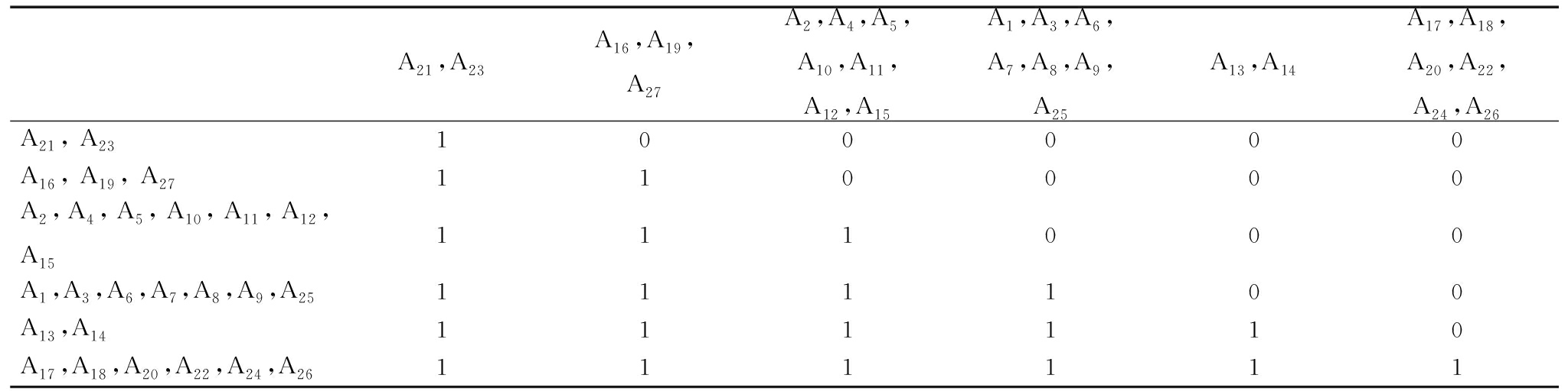 A21,A23A16,A19,A27A2,A4,A5,A10,A11,A12,A15A1,A3,A6,A7,A8,A9,A25A13,A14A17,A18,A20,A22,A24,A26A21, A23100000A16, A19, A27110000A2,A4,A5,A10,A11,A12,A15111000A1,A3,A6,A7,A8,A9,A25111100A13,A14111110A17,A18,A20,A22,A24,A26111111