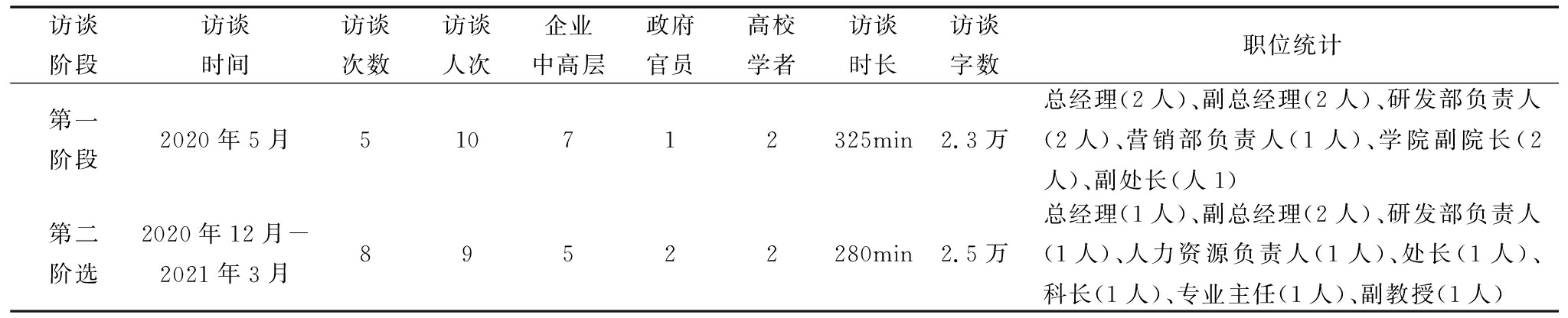 访谈阶段访谈时间访谈次数访谈人次企业中高层政府官员高校学者访谈时长访谈字数职位统计第一阶段2020年5月510712325min2.3万总经理(2人)、副总经理(2人)、研发部负责人(2人)、营销部负责人(1人)、学院副院长(2人)、副处长(人1)第二阶选2020年12月-2021年3月89522280min2.5万总经理(1人)、副总经理(2人)、研发部负责人(1人)、人力资源负责人(1人)、处长(1人)、科长(1人)、专业主任(1人)、副教授(1人)