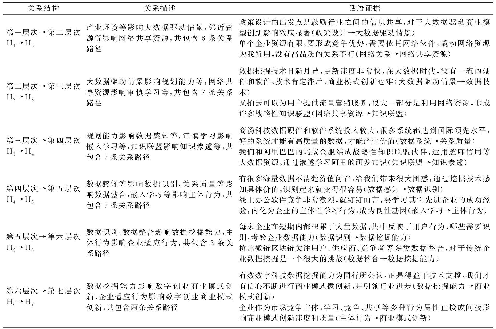 关系结构关系描述话语证据第一层次→第二层次H1→H2产业环境等影响大数据驱动情景,邻近资源等影响网络共享资源,共包含6条关系路径政策设计的出发点是鼓励行业之间的信息共享,对于大数据驱动商业模型创新影响效应显著(政策设计→大数据驱动情景)单个企业资源有限,要形成竞争优势,需要依托网络伙伴,撬动网络资源为我所用,没有高品质的关系不行(网络关系→网络共享资源)第二层次→第三层次H2→H3大数据驱动情景影响规划能力等,网络共享资源影响审慎学习等,共包含7条关系路径数据挖掘技术日新月异,更新速度非常快,在大数据时代,没有一流的硬件和软件,技术肯定滞后,商业模式创新也难(大数据驱动情景→数据技术)又拍云可以为用户提供流量营销服务,很大一部分是利用网络资源,形成许多战略性知识联盟(网络共享资源→知识联盟)第三层次→第四层次H3→H4规划能力影响数据感知等,审慎学习影响嵌入学习等,知识联盟影响知识渗透等,共包含7条关系路径商汤科技数据硬件和软件系统投入较大,很多系统都达到国际领先水平,好的系统才能有高质量的数据,才能产生价值(数据系统→关系质量)我们和阿里巴巴的蚂蚁金服结成战略性知识联盟伙伴,运用芝麻信用等大数据资源,通过渗透学习阿里的研发知识(知识联盟→知识渗透)第四层次→第五层次H4→H5数据感知等影响数据识别,关系质量等影响数据整合,嵌入学习等影响主体行为,共包含7条关系路径有很多海量数据不清楚价值何在,给我们带来很大困惑,通过挖掘技术感知具体价值,识别起来就变得很容易(数据感知→数据识别)线上办公软件竞争非常激烈,就钉钉而言,要学习其它先进企业的成功经验,内化为企业的主体性学习行为,成为良性基因(嵌入学习→主体行为)第五层次→第六层次H5→H6数据识别、数据整合影响数据挖掘能力,主体行为影响企业适应行为,共包含3条关系路径每家企业在短期内都积累了大量数据,集中反映了用户行为,哪些需要识别,考验企业数据能力(数据识别→数据挖掘能力)杭州微链区块链关注用户、供应商、竞争者等多类数据整合,对于传统企业数据挖掘是一个很大的挑战(数据整合→数据挖掘能力)第六层次→第七层次H6→H7数据挖掘能力影响数字创业商业模式创新,企业适应行为影响数字创业商业模式创新,共包含两条关系路径有数数字科技数据挖掘能力为同行所公认,正是得益于技术支撑,我们才有信心不断进行商业模式微创新,并引领行业进步(数据挖掘能力→商业模式创新)企业作为市场竞争主体,学习、竞争、共享等多种行为属性直接或间接影响商业模式创新速度和质量(主体行为→商业模式创新)