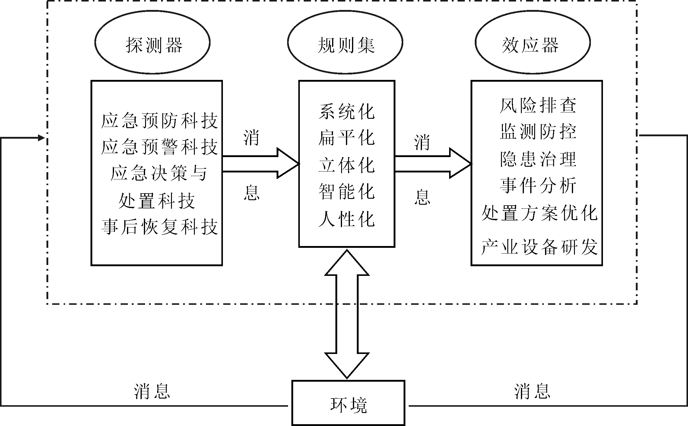 探测器能够把获取的刺激转化为信息流,进一步传递给规则集,主体会按照系统规则对信息进行处理。其中,规则集包括系统化规则、扁平化规则、立体化规则、智能化规则、人性化规则。应急科技系统规则集对信息进行分析处理后,将指令传递给效应器,被指令激活的效应器会采取相应行动,并对环境产生作用。应急科技系统效应器包含风险排查、监测防控、隐患治理、事件分析、处置方案优化、产业设备研发六大响应机制。效应器的响应行为会作用于环境,将新的应急科技产业、装备需求反馈给应急科技系统探测器,开展下一轮应急科技产业、装备循环,直至研发出符合应急管理实际需求的应急科技装备,使应急突发事件得到高效处置。