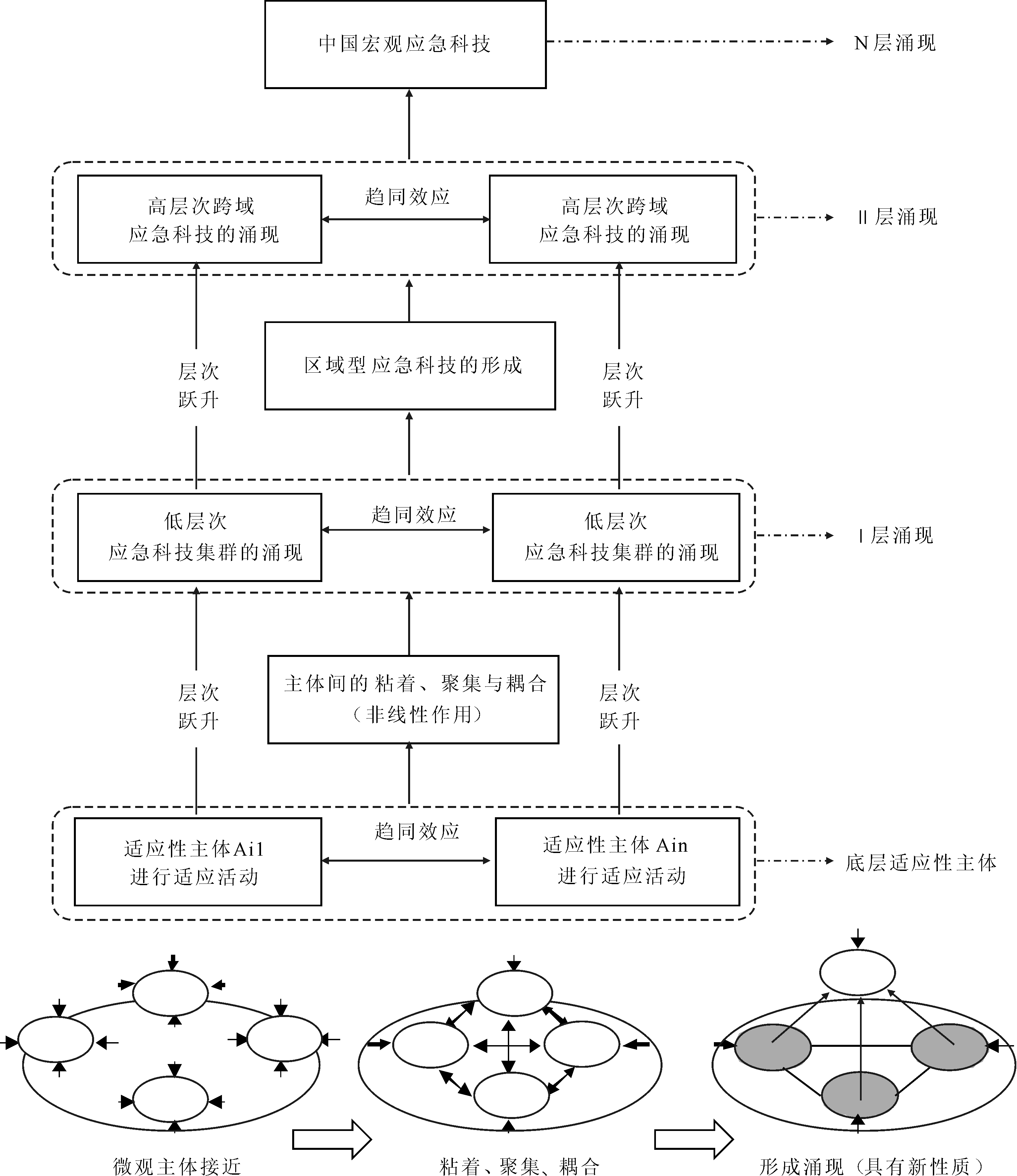 在复杂系统中,不同主体的自适应性行为表现出一致性,本文把这种现象称之为主体间趋同效应。在这种效应的作用下,各主体交互影响,开展类似的适应性活动,之后各涌现现象之间通过相互影响进行类似活动,并在主体非线性作用下向更高层次涌现跃升。以此类推,在涌现层次不断跃升过程中,系统整体逐渐呈现巨大、复杂的涌现现象。