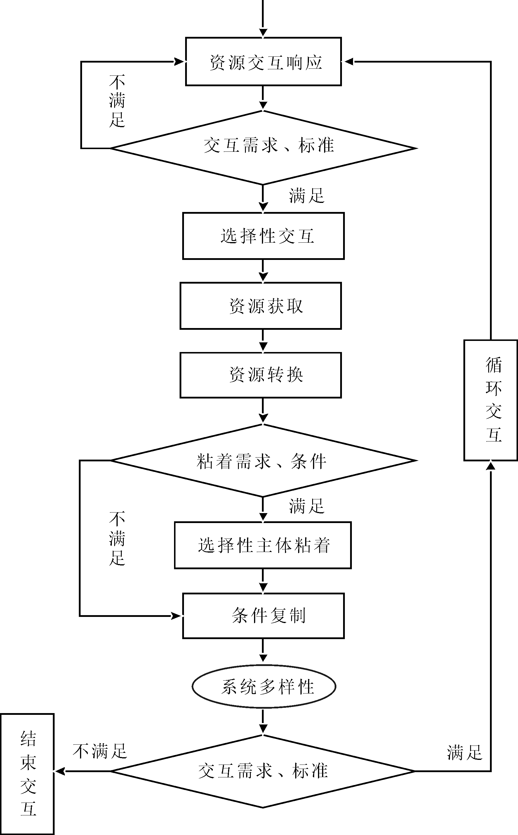 应急科技系统各主体以及主体与外部环境之间进行多种多样的资源交互,保障应急科技系统及应急产业发展所需资源合理、高效地使用。本文基于回声模型分析应急科技系统中的资源交互模式,基本回声模型包括进攻标识、防御标识、资源库等机制。在该模型中,多主体之间通过匹配交换资源,并进行资源存储加工,当资源足够时,会产生新的主体。由于系统行为的复杂性,基本回声模型不能对其进行全面描述,因此霍兰教授在1995年对回声模型进行扩展,增加条件复制、资源变换、学习和创新等多种机制。参考已有文献,本研究认为,应急科技系统回声模型主要包括以下内容:选择性交互、资源获取、资源转换、选择性主体粘着、条件复制和循环交互,如图4所示[30]。