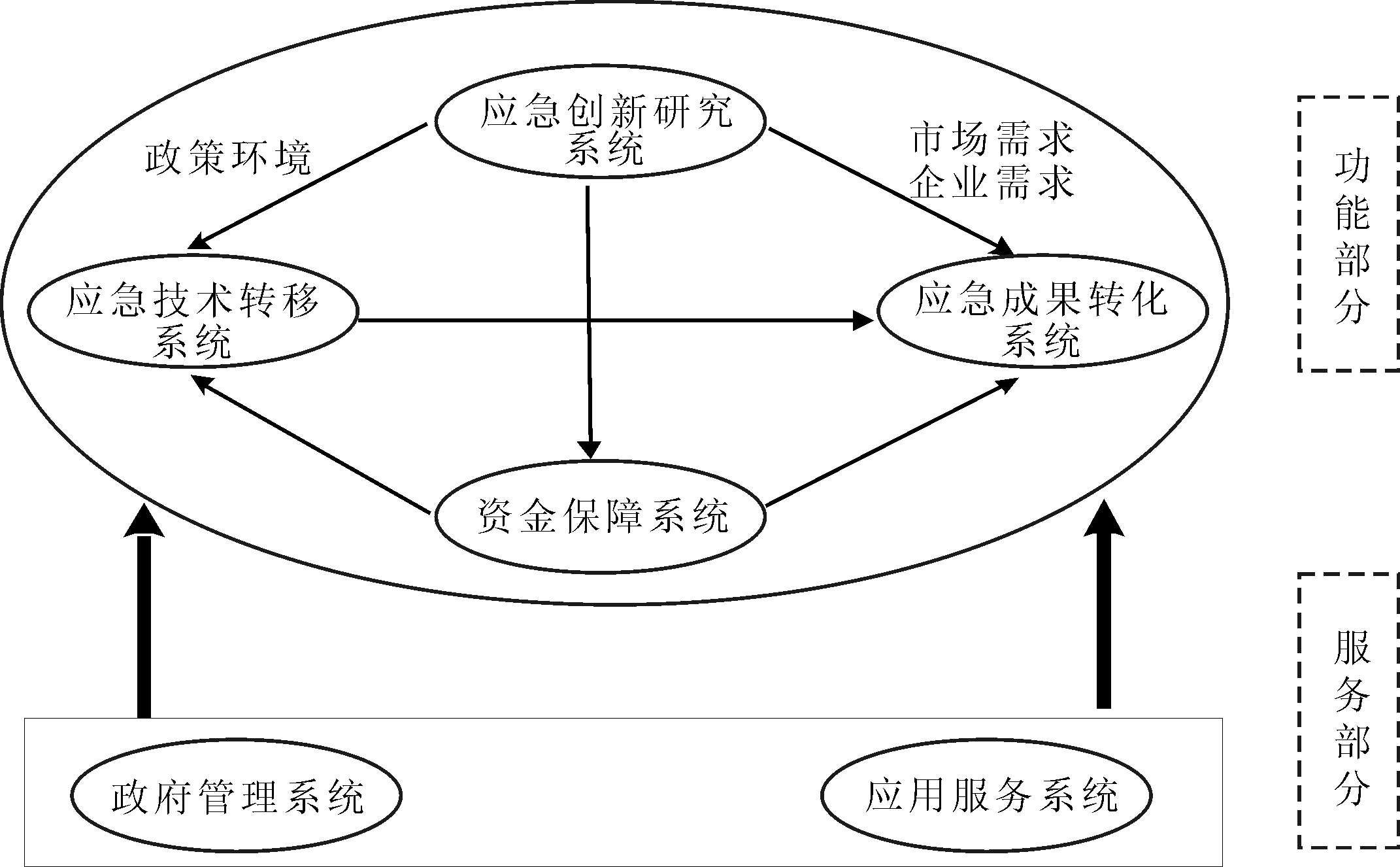 由图2可知,应急创新研究系统是以政府为主导,以研究院所、高校科研团队为核心,以企业研发团队为技术支撑,在国家应急科研工作部署下,由众多主体广泛参与的具有知识创新、产出创新、技术创新、平台创新等属性的公共管理系统。应急技术转移系统是应急科学技术向生产力转化的关键环节,即在政府宏观指导下,集研究院所、高校等主体的科技资源优势,以物联网等网络化信息系统为支撑,实现跨部门、跨行业、跨地区的应急技术转移系统,有利于加强科研机构、企业、高校之间的合作。应急科技成果转化系统是指基于应急管理实际技术需求,通过多种方式,将应急科技成果从科学研究与技术形态转化为具有实用价值的实践成果。应用服务系统是指科技中介机构凭借自身资源、技术、政策优势,面向从事应急产业的企业开展管理咨询、应急技术创新决策、创新资源配置、应急科技成果评估等专业化服务的综合服务体系。资金保障系统是指以政府为主导、基金会等社会组织参与,提供资金以保障子系统正常运行。政府管理系统是指政府相关部门采取行政或法律手段,指导和规范各应急科研主体的行为。通过政策制定、标准执行,对应急科技系统运行进行监管,助推应急产业发展,完善应急科技系统。