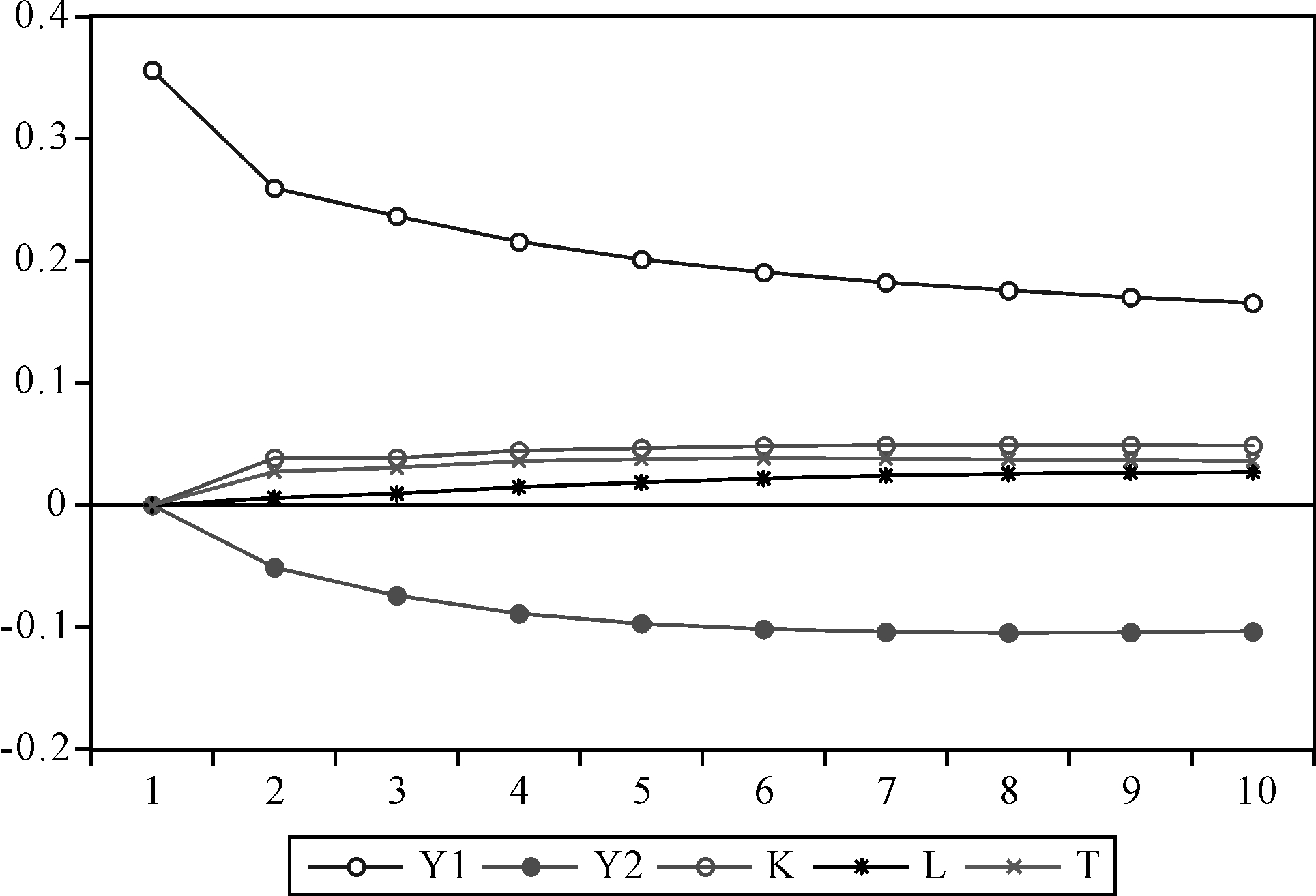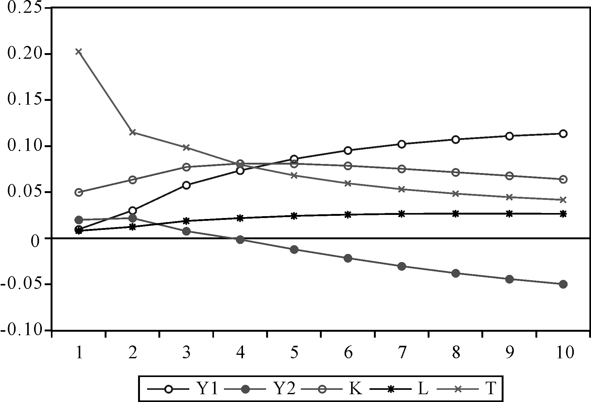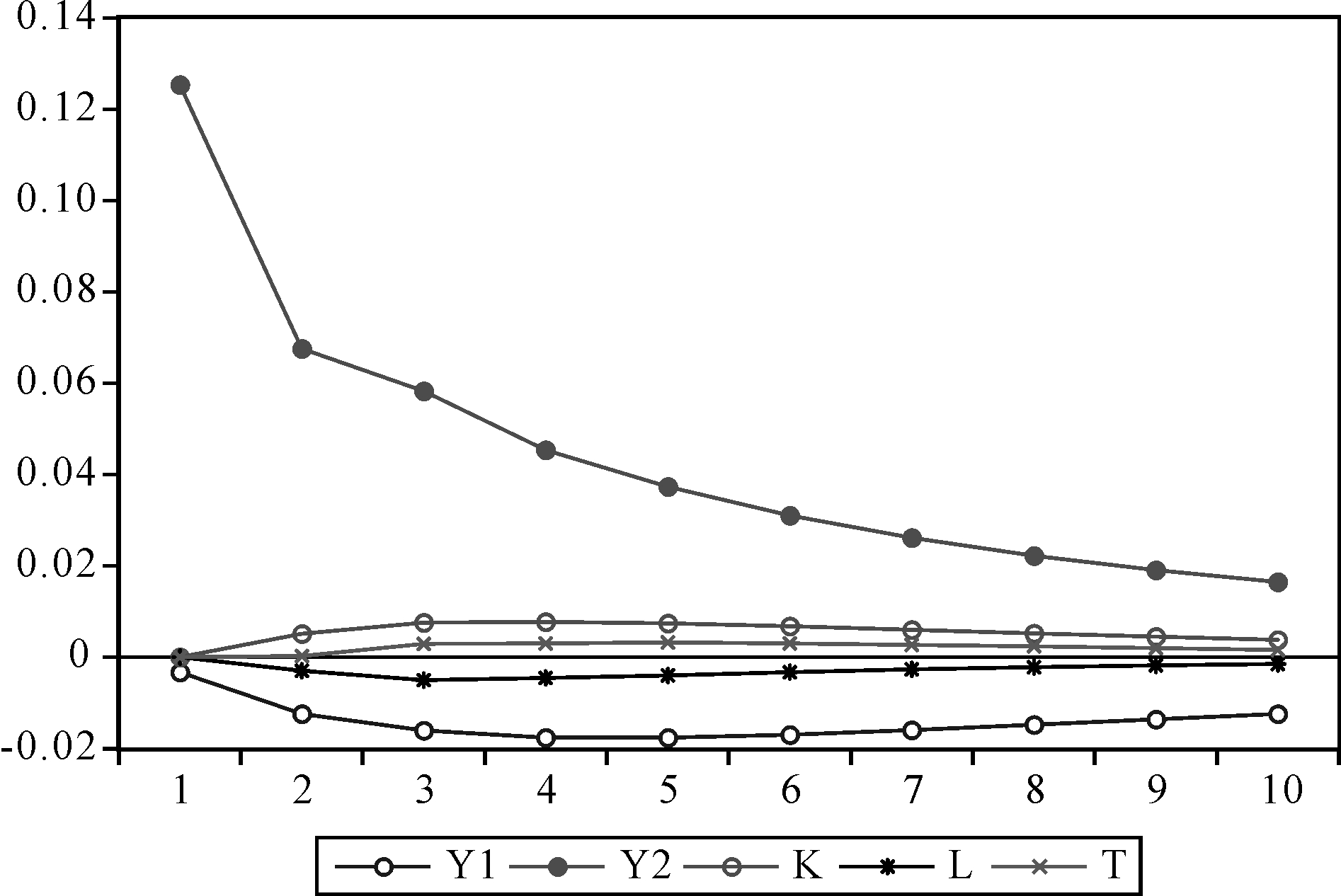 技术积累的脉冲响应函数如图5所示。可以发现,首先,研发经费一个标准差的正向冲击对其影响最大,当期就发挥效用,至第四期达到极大值后略有下降;其次是创新数量的冲击,当期发挥效用,随后迅速提高,作用时间较长,说明创新数量对技术积累具有较强的正向反馈;再次是研发劳动力的冲击,当期发挥效用,总体较平稳,作用时间较长;最后是创新质量的冲击,其当期发挥效用,但是弹性系数总体不大,并且从第四期开始衰减为负数,说明创新质量对技术积累的反馈作用有待提高。