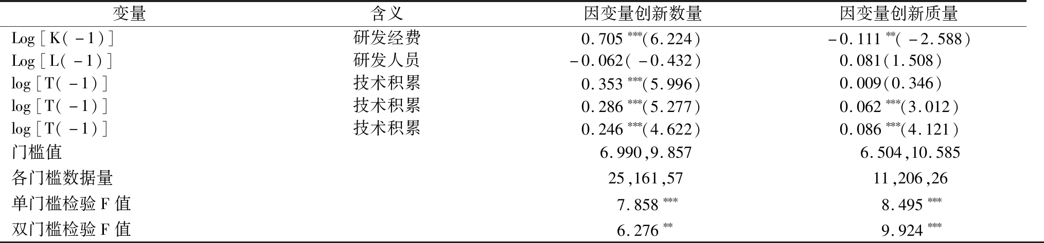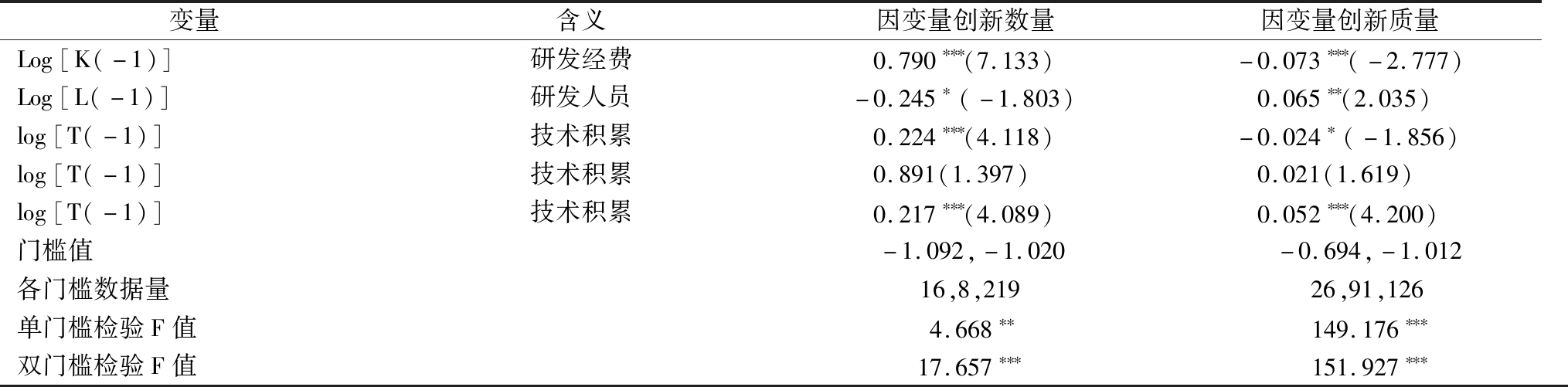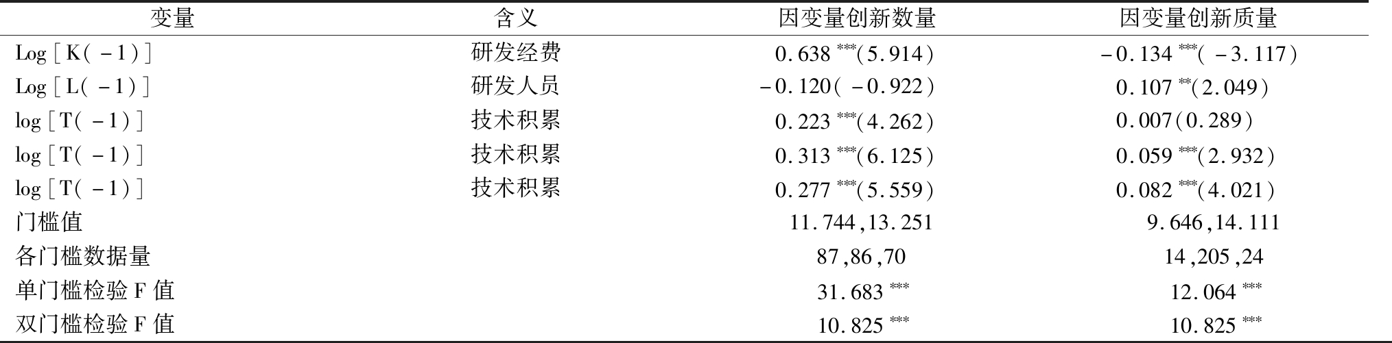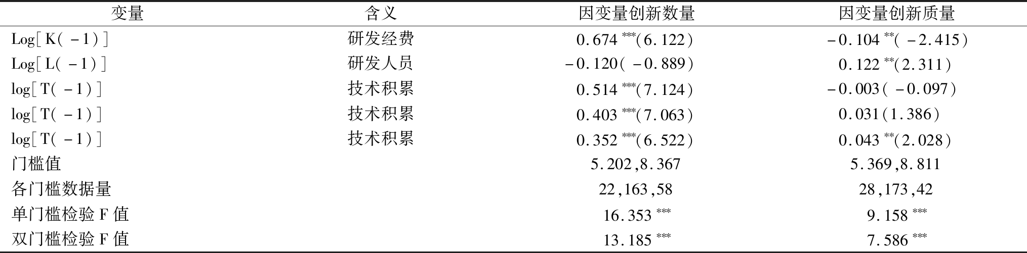 分别以创新数量、创新质量作为因变量,研发经费、研发人员作为控制变量,技术积累作为核心变量,创新质量作为门槛变量,采用面板门槛回归模型进行回归,实证结果如表5所示。