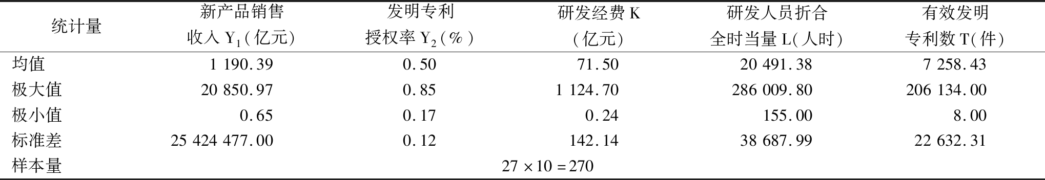 统计量新产品销售收入Y1(亿元)发明专利授权率Y2(%)研发经费K(亿元)研发人员折合全时当量L(人时)有效发明专利数T(件)均值1190.390.5071.5020491.387258.43极大值20850.970.851124.70286009.80206134.00极小值0.650.170.24155.008.00标准差25424477.000.12142.1438687.9922632.31样本量27×10=270
