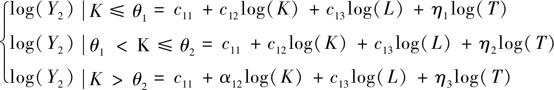 式(6)考虑了双门槛情形,即存在2个研发经费门槛θ1和θ2,使得技术积累对创新质量的弹性出现显著差异,当K≤θ1时,T对创新质量的弹性为η1;当θ1