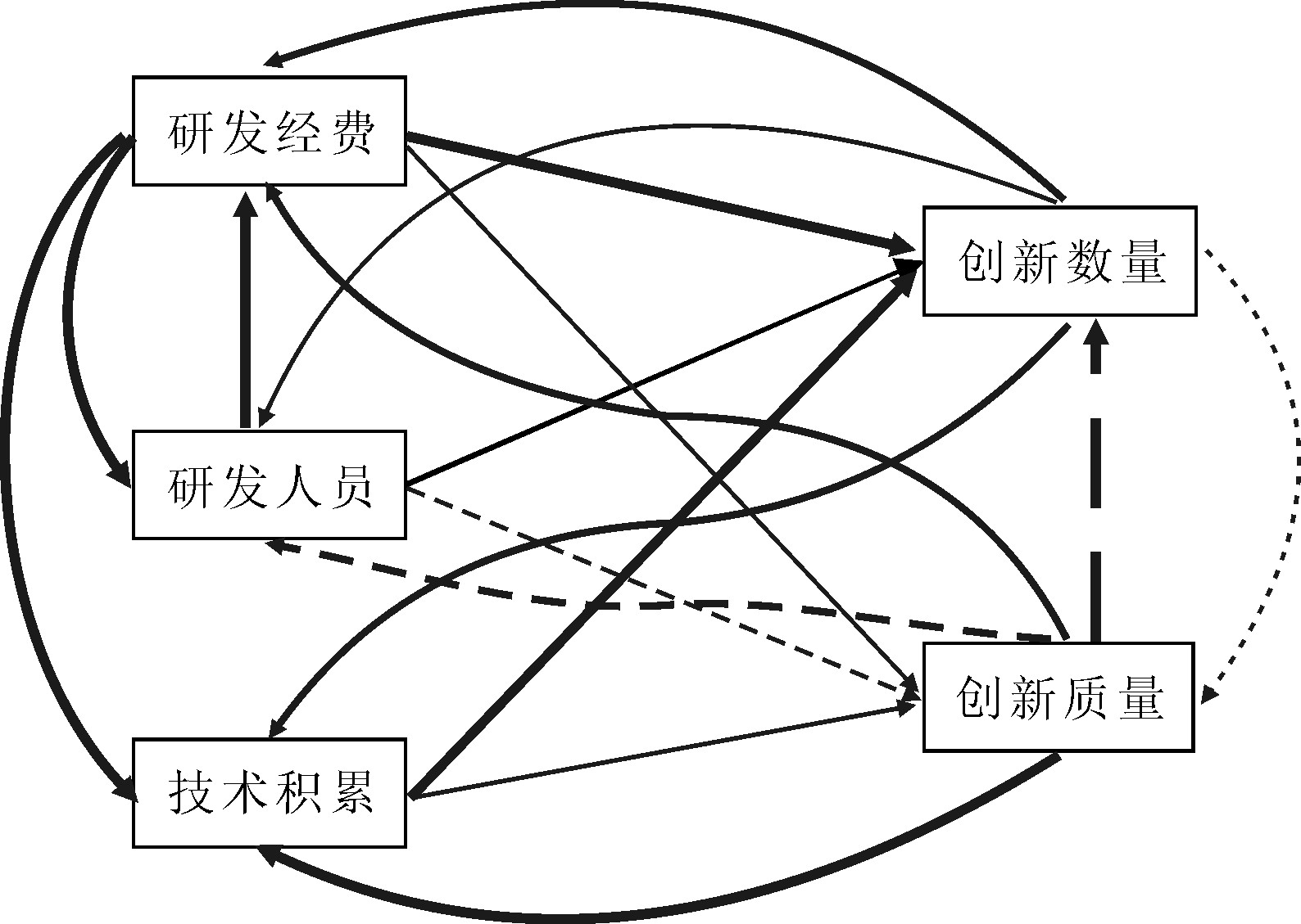 联立方程可视化结果如图2所示,图中实线表示正相关,虚线表示负相关,箭头表示变量影响方向,线宽表示弹性大小。图中可以明显看出,创新数量提升有较好的方法,总体线条较宽,而创新质量提升尚缺乏有效手段,总体线条较窄。技术积累对创新数量的贡献大于创新质量,并且创新质量的反馈对技术积累的影响更显著。