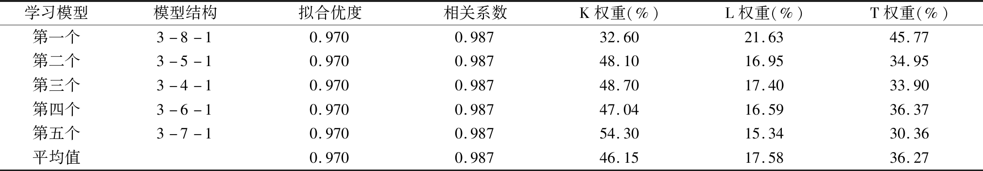学习模型模型结构拟合优度相关系数K权重(%)L权重(%)T权重(%)第一个3-8-10.9700.98732.6021.6345.77第二个3-5-10.9700.98748.1016.9534.95第三个3-4-10.9700.98748.7017.4033.90第四个3-6-10.9700.98747.0416.5936.37第五个3-7-10.9700.98754.3015.3430.36平均值0.9700.98746.1517.5836.27