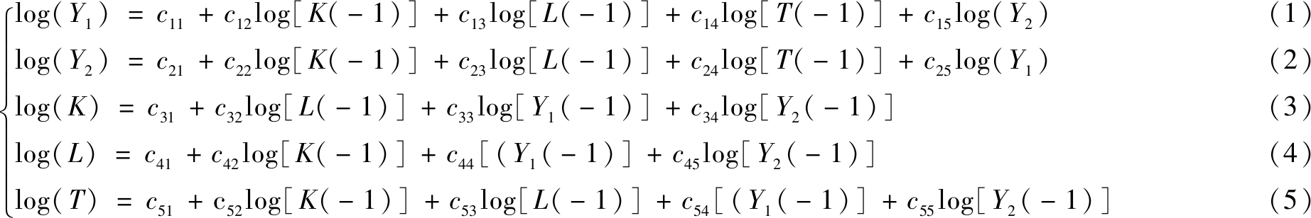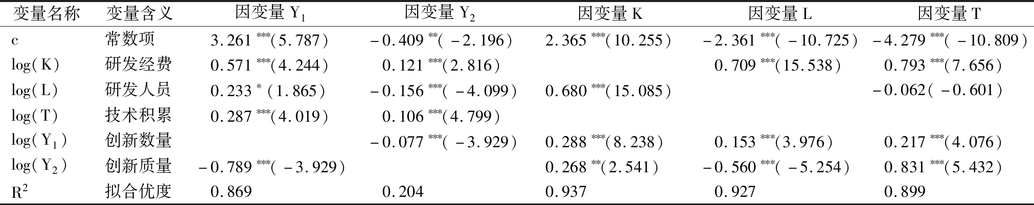 式中,Y1为创新数量,Y2为创新质量,K为研发经费、L为研发人员,T为技术积累。cij表示回归系数,其中,i表示方程序号,j代表变量序号,i,j=1,2,3,4,5。