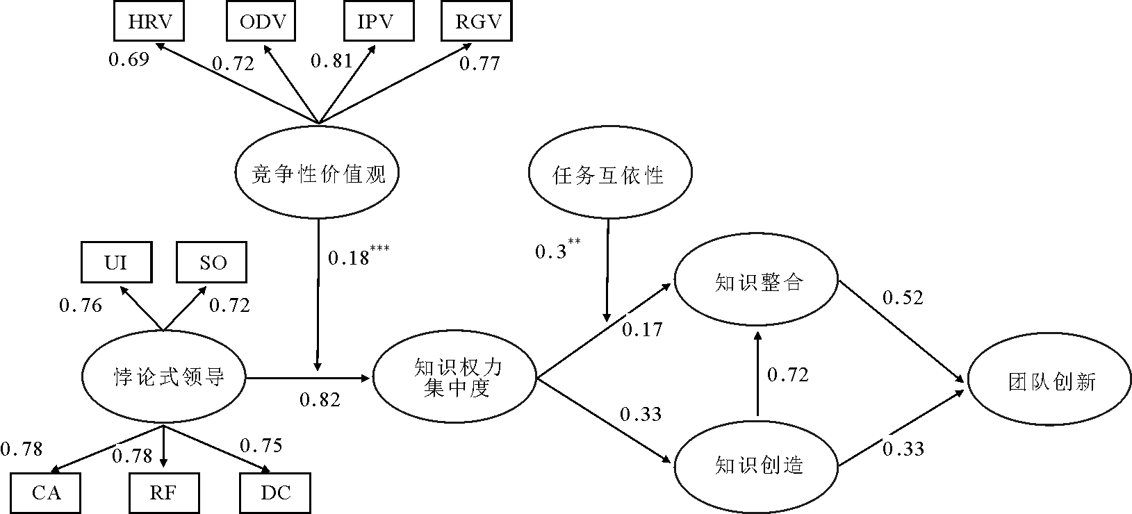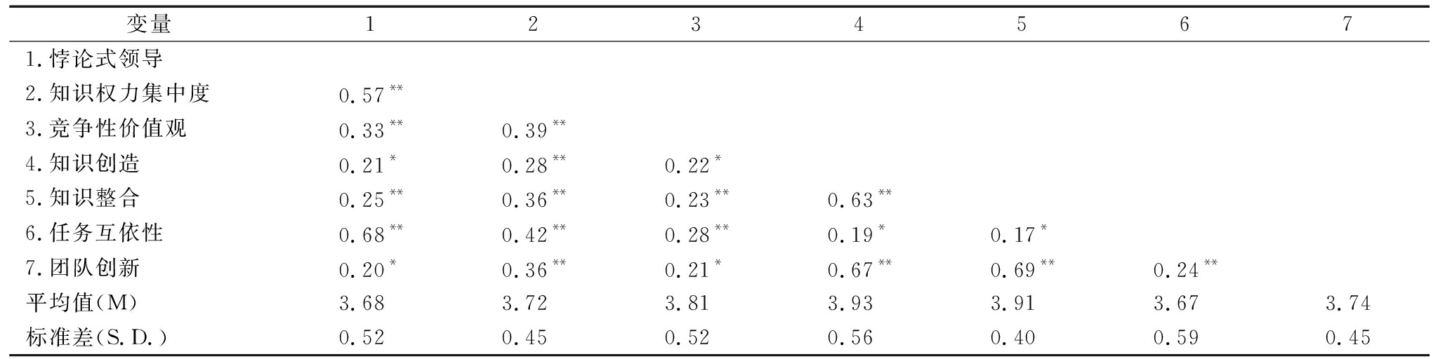 变量12345671.悖论式领导2.知识权力集中度0.57**3.竞争性价值观0.33**0.39**4.知识创造0.21*0.28**0.22*5.知识整合0.25**0.36**0.23**0.63**6.任务互依性0.68**0.42**0.28**0.19*0.17*7.团队创新0.20*0.36**0.21*0.67**0.69**0.24**平均值(M)3.683.723.813.933.913.673.74标准差(S.D.)0.520.450.520.560.400.590.45
