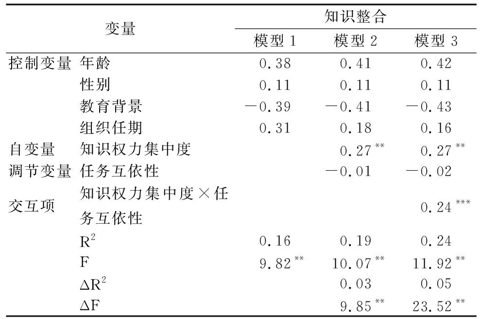 变量知识整合模型1模型2模型3控制变量年龄0.380.410.42性别0.110.110.11教育背景-0.39-0.41-0.43组织任期0.310.180.16自变量 知识权力集中度0.27**0.27**调节变量任务互依性-0.01-0.02交互项 知识权力集中度×任务互依性0.24***R20.160.190.24F9.82**10.07**11.92**ΔR20.030.05ΔF9.85**23.52**