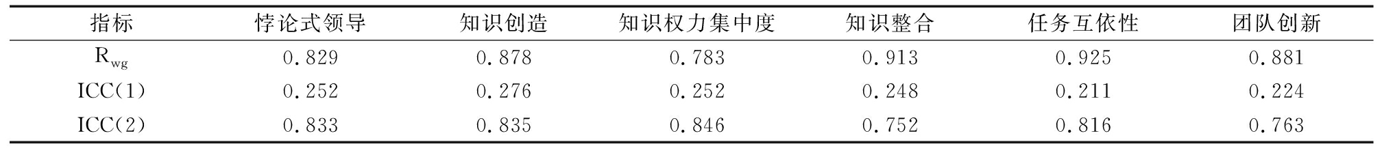 本研究从团队层面探讨悖论式领导对团队创新的影响及作用机理,因此有必要对个体层面数据进行聚合检验,采用Rwg、ICC(1)、ICC(2)等指标评价团队数据聚合度。验证结果显示,组内一致性程度值Rwg大于0.7,组内差异程度值ICC(1)大于0.05,而组间差异值ICC(2)大于0.5,说明本文研究数据均符合一致性判定标准。本研究中,由于竞争性价值观属于团队层面数据,因此该部分数据不需要进行聚合检验。经计算全样本数据,各变量聚合检验结果如表1所示,可以发现,各研究变量都满足rwg>0.7,ICC(1)>0.12, ICC(2)>0.7,符合数据聚合判断标准。