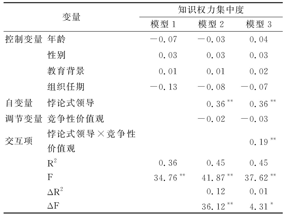 变量知识权力集中度模型1模型2模型3控制变量年龄-0.07-0.030.04性别0.030.030.03教育背景0.010.010.02组织任期-0.13-0.08-0.07自变量 悖论式领导0.36**0.36**调节变量竞争性价值观-0.02-0.03交互项 悖论式领导×竞争性价值观0.19**R20.360.450.45F34.76**41.87**37.62**ΔR20.120.01ΔF36.12**4.31*