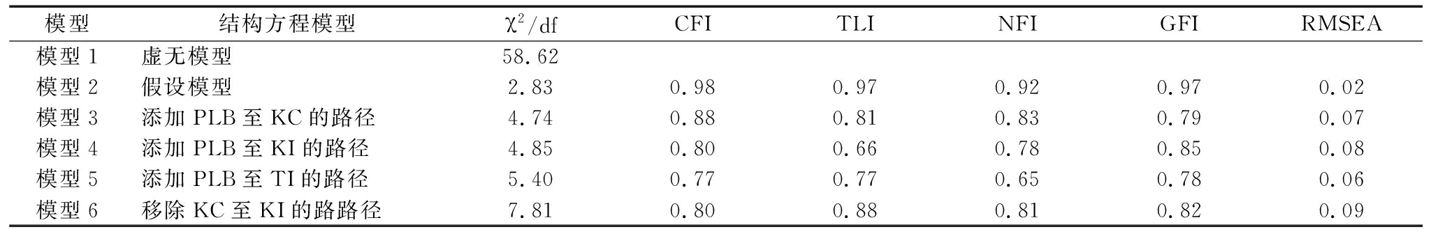 模型结构方程模型χ2/dfCFITLINFIGFIRMSEA模型1虚无模型58.62模型2假设模型2.830.980.970.920.970.02模型3添加PLB至KC的路径4.740.880.810.830.790.07模型4添加PLB至KI的路径4.850.800.660.780.850.08模型5添加PLB至TI的路径5.400.770.770.650.780.06模型6移除KC至KI的路路径7.810.800.880.810.820.09