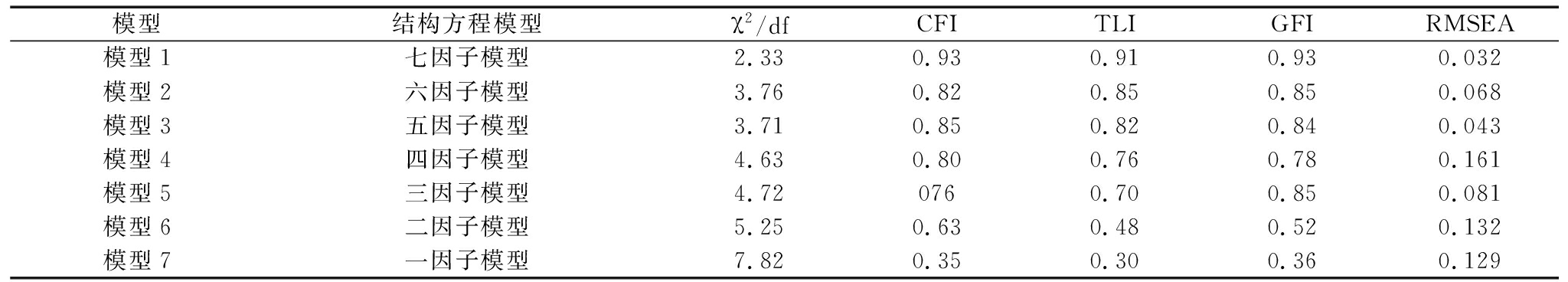 模型结构方程模型χ2/dfCFITLIGFIRMSEA模型1七因子模型2.330.930.910.930.032模型2六因子模型3.760.820.850.850.068模型3五因子模型3.710.850.820.840.043模型4四因子模型4.630.800.760.780.161模型5三因子模型4.720760.700.850.081模型6二因子模型5.250.630.480.520.132模型7一因子模型7.820.350.300.360.129