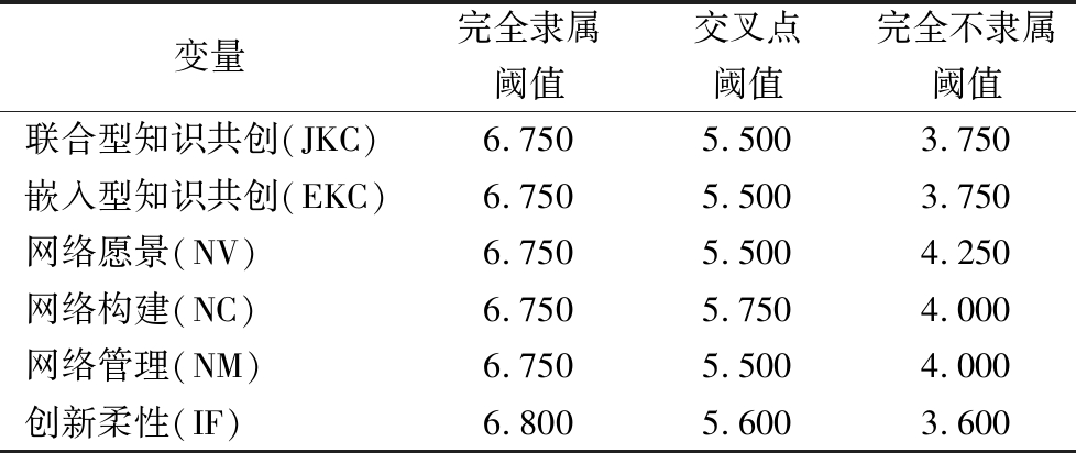 定性比较分析法分为3类,分别是清晰集QCA(csQCA)、多值集QCA(mvQCA)以及模糊集QCA(fsQCA),相对于前两种类型,fsQCA更适合处理连续变量。本研究涉及联合型知识共创(JKC)、嵌入型知识共创(EKC)、网络愿景(NV)、网络构建(NC)、网络管理(NM)5个前因变量以及结果变量创新柔性(IF)的取值不符合清晰集或多值集要求,而是符合模糊集的条件。因此,本文选择fsQCA方法。