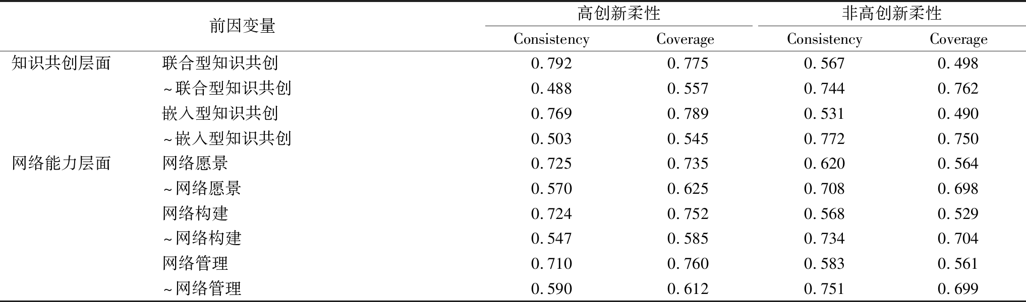 前因变量高创新柔性ConsistencyCoverage非高创新柔性ConsistencyCoverage知识共创层面联合型知识共创0.7920.7750.5670.498~联合型知识共创0.4880.5570.7440.762嵌入型知识共创0.7690.7890.5310.490~嵌入型知识共创0.5030.5450.7720.750网络能力层面网络愿景0.7250.7350.6200.564~网络愿景0.5700.6250.7080.698网络构建0.7240.7520.5680.529~网络构建0.5470.5850.7340.704网络管理0.7100.7600.5830.561~网络管理0.5900.6120.7510.699