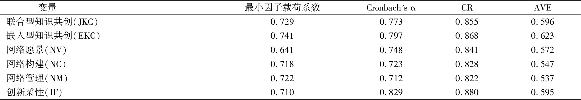 变量最小因子载荷系数Cronbach's αCRAVE联合型知识共创(JKC)0.7290.7730.8550.596嵌入型知识共创(EKC)0.7410.7970.8680.623网络愿景(NV)0.6410.7480.8410.572网络构建(NC)0.7180.7230.8280.547网络管理(NM)0.7220.7120.8220.537创新柔性(IF)0.7100.8290.8800.595