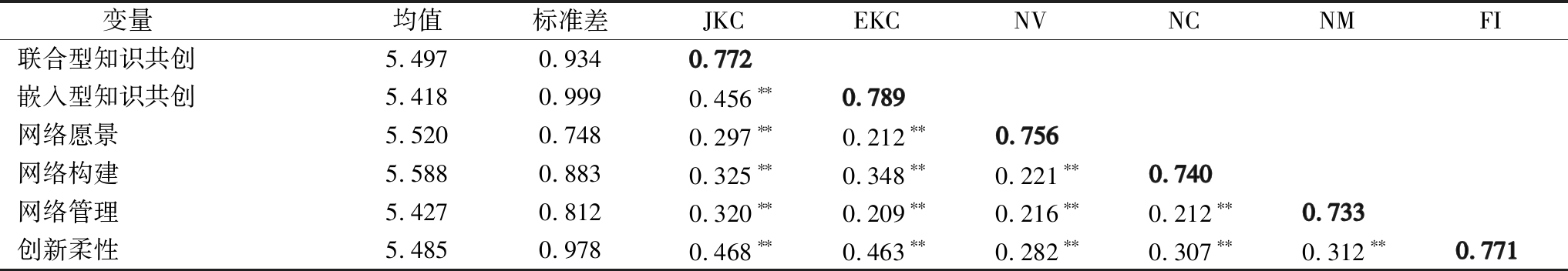 注:N=323,对角线加粗为各变量AVE平方根,下三角为变量间相关系数,**p<0.01