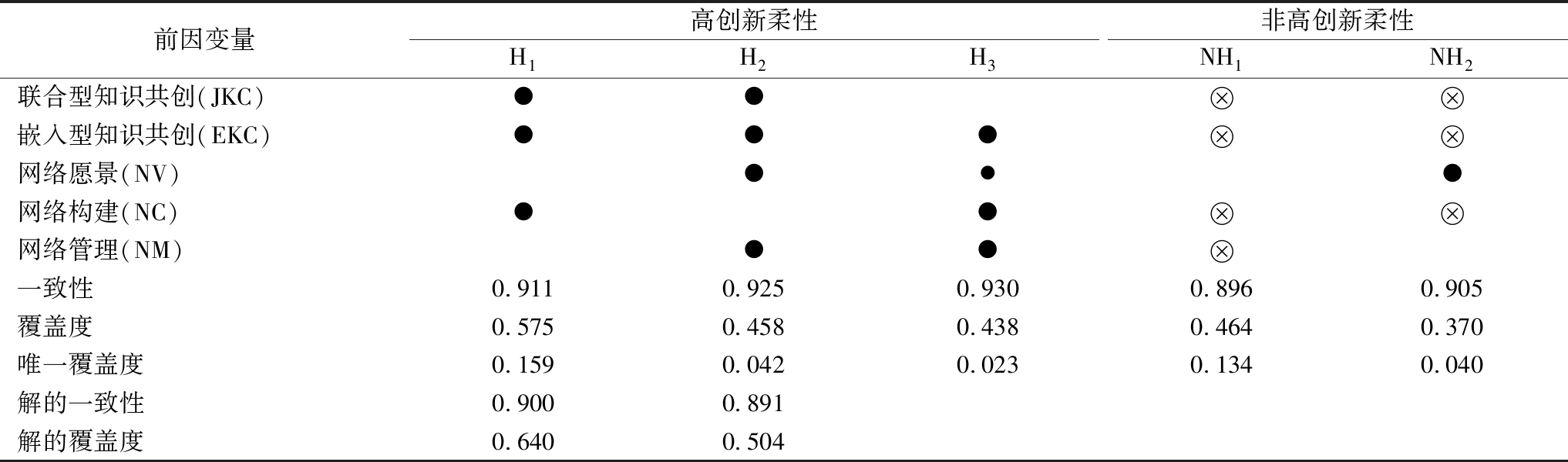 前因变量高创新柔性H1H2H3非高创新柔性NH1NH2联合型知识共创(JKC)●● 嵌入型知识共创(EKC)●●● 网络愿景(NV)●●●网络构建(NC)●● 网络管理(NM)●● 一致性0.9110.9250.9300.8960.905覆盖度0.5750.4580.4380.4640.370唯一覆盖度0.1590.0420.0230.1340.040解的一致性0.9000.891解的覆盖度0.6400.504