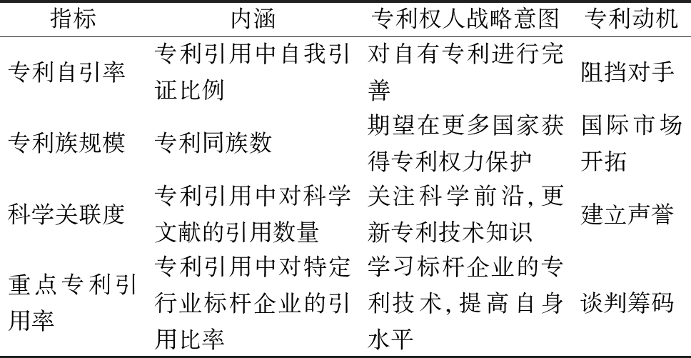 关于专利战略对创新绩效的影响,后续学者主要从专利价值评估指标、专利组合构建方法、战略指标体系、专利布局等方面展开大量研究[11]。在专利战略指标体系构建方面,郭磊[12]指出,可以运用权力宽度、技术宽度、专利族规模、科学关联度等对专利战略进行测量。如表1所示,依据专利权人的战略意图,构建专利价值定量评价指标体系,也可称为专利战略指标[12]。此外,在专利组合构建方面,Ernst等[13]最早使用专利申请国家数、专利引用率、专利授权率等可量化指标,并对由此得到的专利组合性进行评估与分析。另外,基于对技术的抽象解析,构建既具有显著技术差异性又具有密切技术相关性的专利组合,从而达到巩固专利组合所有者竞争优势的目的[11]。