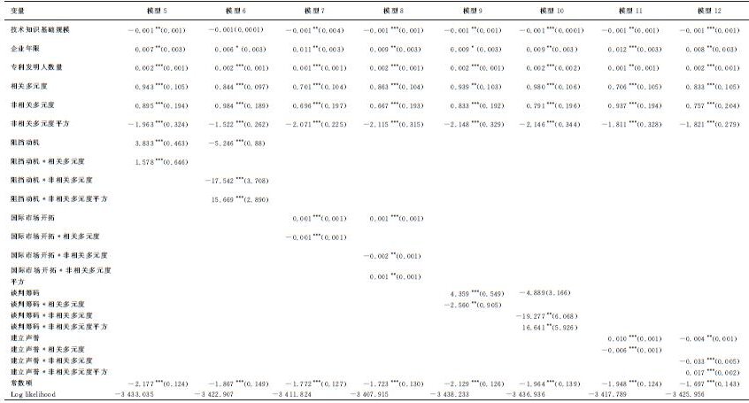 变量模型5模型6模型7 模型8 模型9 模型10模型11 模型12技术知识基础规模-0.001∗∗(0.001)-0.001(0.0001)-0.001∗∗(0.004)-0.001∗∗∗(0.001)-0.001∗∗(0.001)-0.001∗∗∗(0.0001)-0.001∗∗(0.001)-0.001∗∗∗(0.001)企业年限0.007∗∗(0.003)0.006∗(0.003)0.011∗∗(0.003)0.009∗∗(0.003)0.009∗(0.003)0.009∗∗(0.003)0.012∗∗∗(0.003)0.008∗∗(0.003)专利发明人数量0.002∗∗∗(0.001)0.002∗∗∗(0.001)0.001∗∗∗(0.001) 0.002∗∗∗(0.001)0.002∗∗∗(0.001)0.002∗∗∗(0.002)0.001∗∗(0.001)0.002∗∗∗(0.001)相关多元度0.943∗∗∗(0.105)0.844∗∗∗(0.097)0.701∗∗∗(0.104)0.863∗∗∗(0.104)0.939∗∗(0.103)0.980∗∗∗(0.106)0.706∗∗∗(0.105)0.833∗∗∗(0.105)非相关多元度0.895∗∗∗(0.194)0.984∗∗∗(0.189)0.696∗∗∗(0.197)0.667∗∗∗(0.193)0.833∗∗∗(0.192)0.791∗∗∗(0.196)0.937∗∗∗(0.194)0.757∗∗∗(0.204)非相关多元度平方-1.963∗∗∗(0.324)-1.522∗∗∗(0.262)-2.071∗∗∗(0.225)-2.115∗∗∗(0.315)-2.148∗∗∗(0.329)-2.146∗∗∗(0.344)-1.811∗∗∗(0.328)-1.821∗∗∗(0.279)阻挡动机3.833∗∗∗(0.463)-5.246∗∗∗(0.88)阻挡动机∗相关多元度1.578∗∗∗(0.646)阻挡动机∗非相关多元度-17.542∗∗∗(3.708)阻挡动机∗非相关多元度平方15.669∗∗∗(2.890)国际市场开拓0.001∗∗∗(0.001)0.001∗∗∗(0.001)国际市场开拓∗相关多元度-0.001∗∗∗(0.001)国际市场开拓∗非相关多元度-0.002∗∗(0.001)国际市场开拓∗非相关多元度平方0.001∗∗(0.001)谈判筹码4.359∗∗∗(0.549)-4.889(3.166)谈判筹码∗相关多元度-2.560∗∗(0.905)谈判筹码∗非相关多元度-19.277∗∗(6.068)谈判筹码∗非相关多元度平方16.641∗∗(5.926)建立声誉0.010∗∗∗(0.001)-0.004∗∗(0.001)建立声誉∗相关多元度-0.006∗∗∗(0.001)建立声誉∗非相关多元度-0.033∗∗∗(0.005)建立声誉∗非相关多元度平方0.017∗∗∗(0.002)常数项-2.177∗∗∗(0.124)-1.867∗∗∗(0.149)-1.772∗∗∗(0.127)-1.723∗∗∗(0.130)-2.129∗∗∗(0.126)-1.964∗∗∗(0.139)-1.948∗∗∗(0.124)-1.697∗∗∗(0.143)Log likelihood-3 433.035-3 422.907-3 411.824-3 407.915-3 438.233-3 436.936-3 417.789-3 425.956