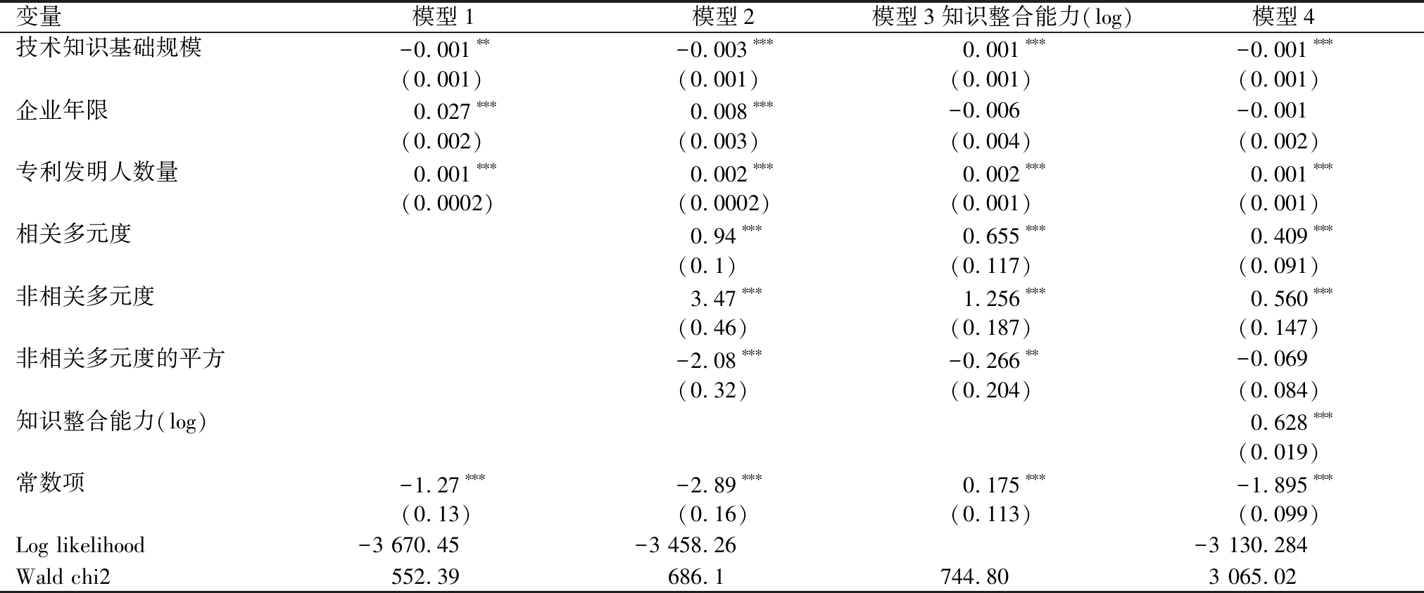 变量模型1模型2模型3知识整合能力(log)模型4技术知识基础规模-0.001∗∗-0.003∗∗∗0.001∗∗∗-0.001∗∗∗(0.001)(0.001)(0.001)(0.001)企业年限0.027∗∗∗0.008∗∗∗-0.006-0.001(0.002)(0.003)(0.004)(0.002)专利发明人数量0.001∗∗∗0.002∗∗∗0.002∗∗∗0.001∗∗∗(0.0002)(0.0002)(0.001)(0.001)相关多元度0.94∗∗∗0.655∗∗∗0.409∗∗∗(0.1)(0.117)(0.091)非相关多元度3.47∗∗∗1.256∗∗∗0.560∗∗∗(0.46)(0.187)(0.147)非相关多元度的平方-2.08∗∗∗-0.266∗∗-0.069(0.32)(0.204)(0.084)知识整合能力(log)0.628∗∗∗(0.019)常数项-1.27∗∗∗-2.89∗∗∗0.175∗∗∗-1.895∗∗∗(0.13)(0.16)(0.113)(0.099)Log likelihood-3 670.45-3 458.26-3 130.284Wald chi2552.39686.1744.803 065.02
