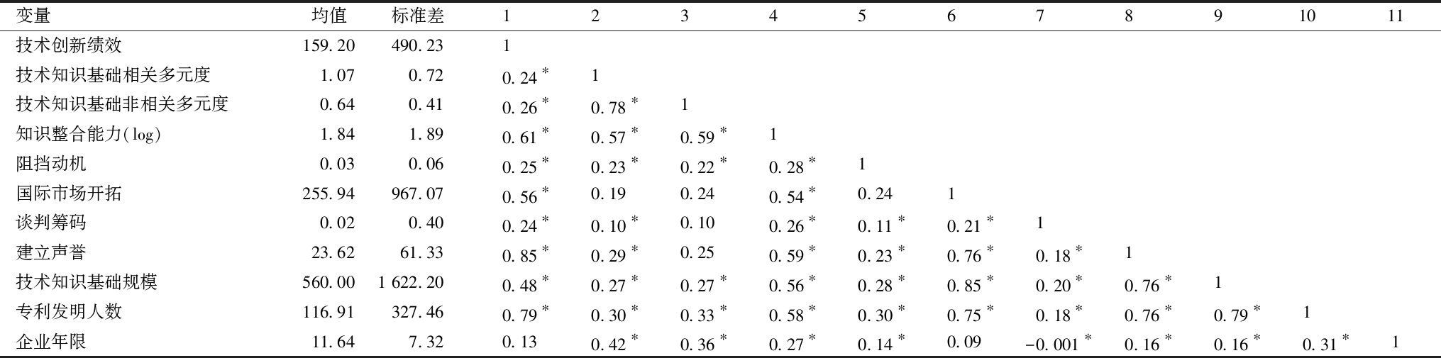 变量均值标准差1234567891011技术创新绩效159.20490.231技术知识基础相关多元度1.070.720.24∗1技术知识基础非相关多元度0.640.410.26∗0.78∗1知识整合能力(log)1.841.890.61∗0.57∗0.59∗1阻挡动机0.030.060.25∗0.23∗0.22∗0.28∗1国际市场开拓255.94967.070.56∗0.190.240.54∗0.241谈判筹码0.020.400.24∗0.10∗0.100.26∗0.11∗0.21∗1建立声誉23.6261.330.85∗0.29∗0.250.59∗0.23∗0.76∗0.18∗1技术知识基础规模560.001 622.200.48∗0.27∗0.27∗0.56∗0.28∗0.85∗0.20∗0.76∗1专利发明人数116.91327.460.79∗0.30∗0.33∗0.58∗0.30∗0.75∗0.18∗0.76∗0.79∗1企业年限11.647.320.130.42∗0.36∗0.27∗0.14∗0.09-0.001∗0.16∗0.16∗0.31∗1