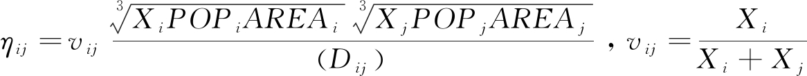 式中,ηij表示地市i与地市j间GTT的关联强度,X表示各市驱动因子,POP表示地市人口,AREA表示地市建成区面积(Built-up area),两地距离选择区间交通距离Dij表示,采用地市i的X与地市i、j的X之和的比重修正经验常数vij,X包含下文选择的6个驱动因子,以此建立地市间GTT驱动因子关联矩阵。