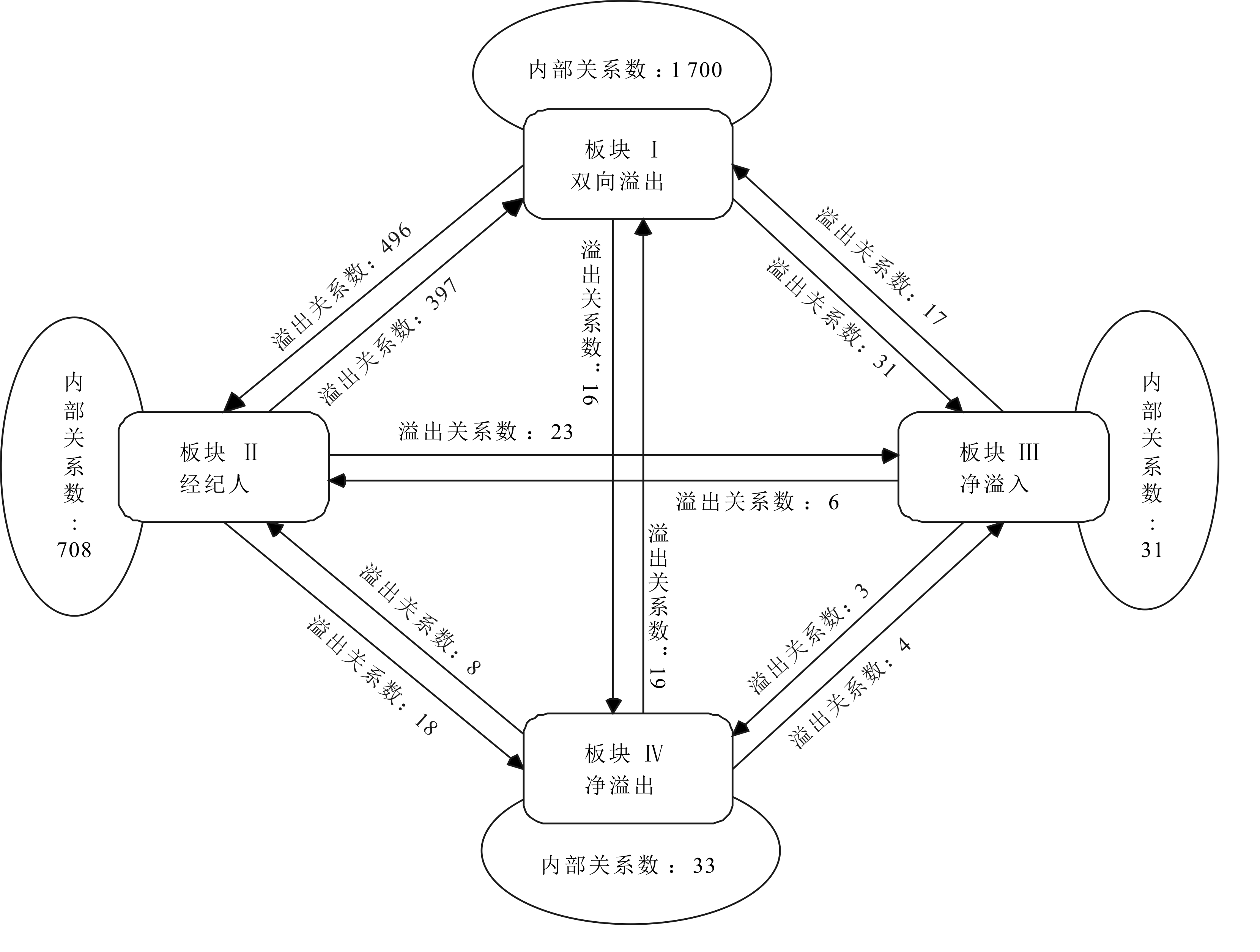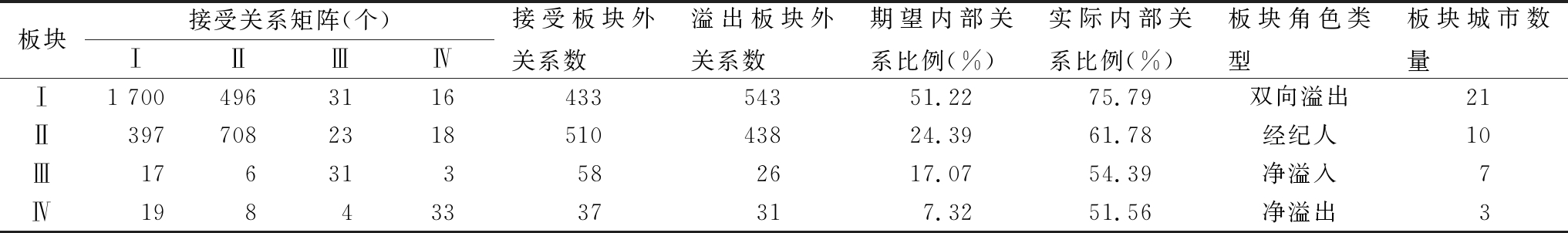 板块接受关系矩阵(个)ⅠⅡⅢⅣ接受板块外关系数溢出板块外关系数期望内部关系比例(%)实际内部关系比例(%)板块角色类型板块城市数量Ⅰ1 700496311643354351.2275.79双向溢出21Ⅱ397708231851043824.3961.78经纪人10Ⅲ176313582617.0754.39净溢入7Ⅳ19843337317.3251.56净溢出3