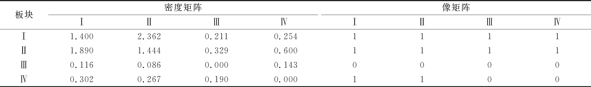 板块密度矩阵ⅠⅡⅢⅣ像矩阵ⅠⅡⅢⅣⅠ1.4002.3620.2110.2541111Ⅱ1.8901.4440.3290.6001111Ⅲ0.1160.0860.0000.1430000Ⅳ0.3020.2670.1900.0001100