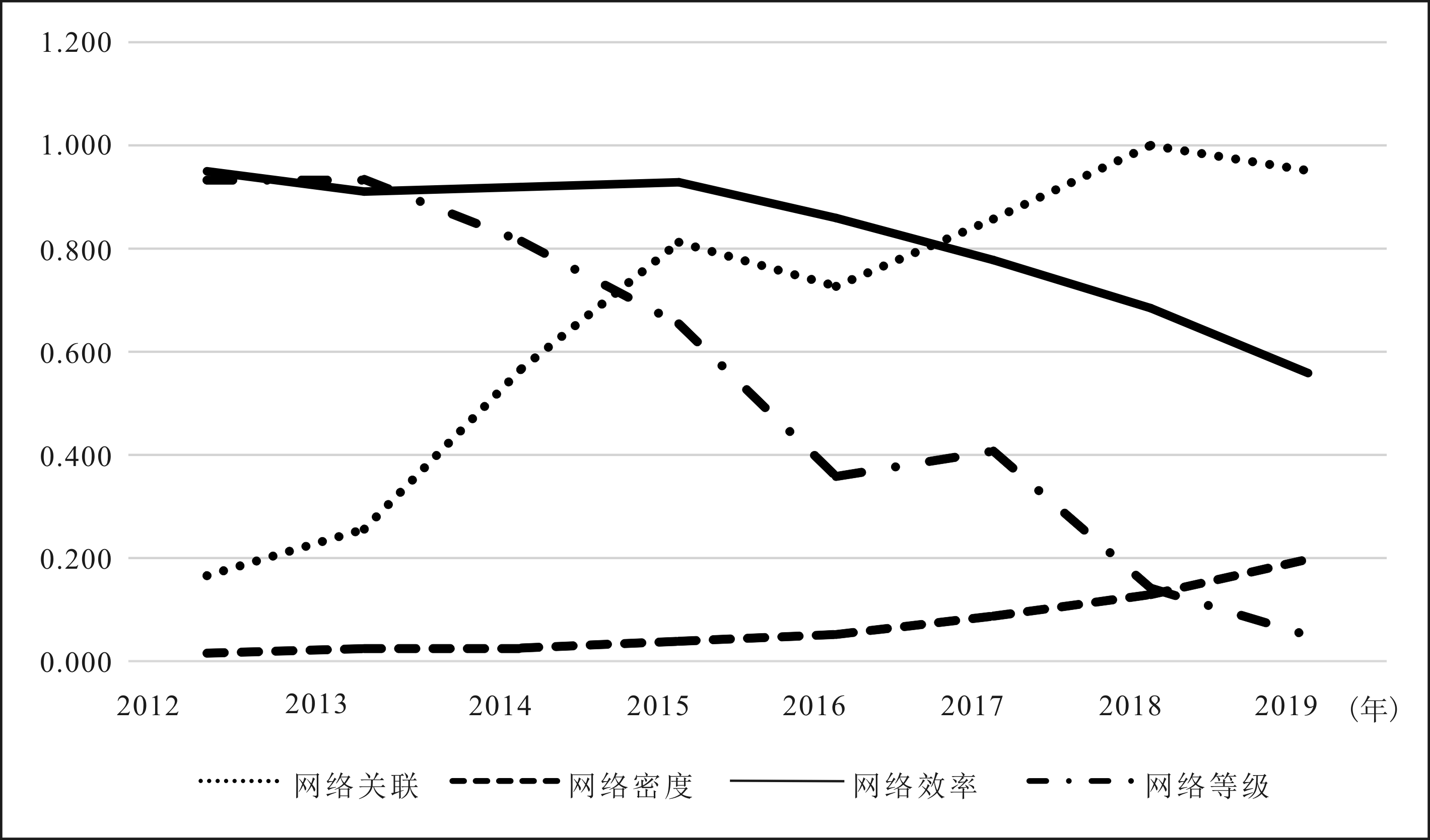 Fig.2 Dynamic evolution trends of key indicators of green technology transfer network structure in the Yangtze River Delta