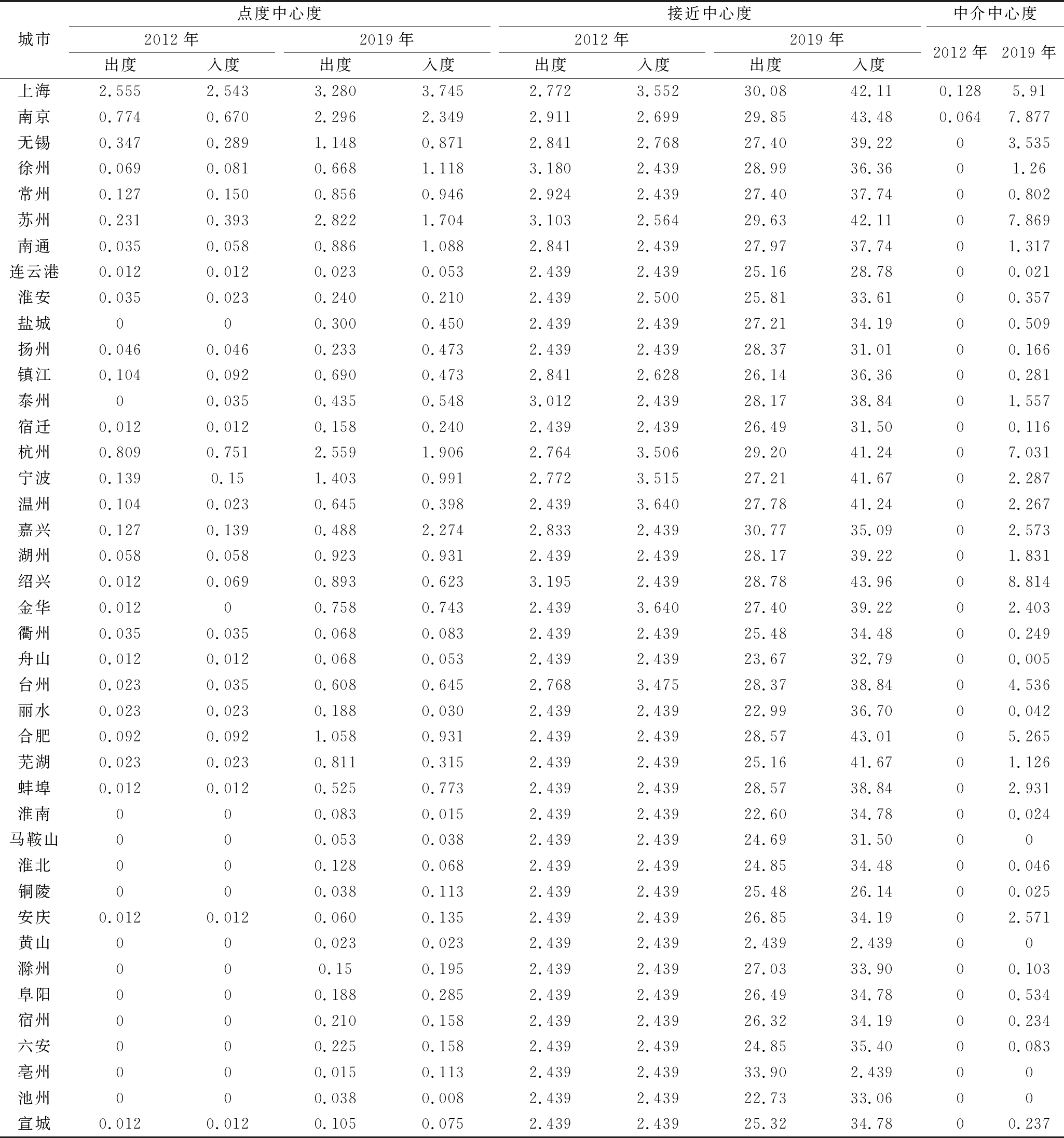 本文进一步剖析点度中心度、中介中心度和接近中心度3个指标,具体见表1,以探寻各地市在长三角GTT空间关联网络中的地位和作用。