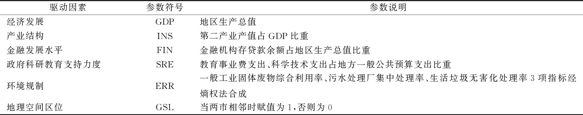 驱动因素参数符号参数说明经济发展GDP地区生产总值产业结构INS第二产业产值占GDP比重金融发展水平FIN金融机构存贷款余额占地区生产总值比重政府科研教育支持力度SRE教育事业费支出、科学技术支出占地方一般公共预算支出比重环境规制ERR一般工业固体废物综合利用率、污水处理厂集中处理率、生活垃圾无害化处理率3项指标经熵权法合成地理空间区位GSL当两市相邻时赋值为1,否则为0