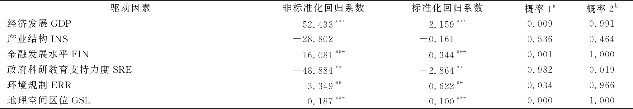 驱动因素非标准化回归系数标准化回归系数概率1a概率2b经济发展GDP52.433***2.159***0.0090.991产业结构INS-28.802-0.1610.5360.464金融发展水平FIN16.081***0.344***0.0011.000政府科研教育支持力度SRE-48.884**-2.864**0.9820.019环境规制ERR3.349**0.622**0.0340.966地理空间区位GSL0.187***0.100***0.0001.000