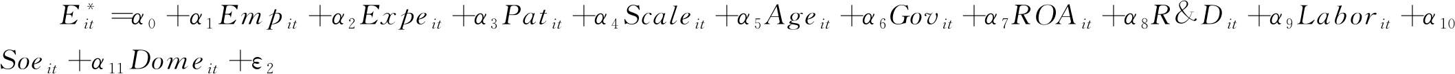 式中,Eit*为因变量,表示企业创新效率值,i代表企业,t代表时间,α为参数,ε为误差项。以各类创新效率影响因素为自变量,参考李雪松和曾宇航[28]、王成东等[29]、肖文和林高榜[24]的做法,本文将影响效率的因素分为投入要素和其它影响因素。投入要素包括人员投入(Per、Emp)、资本投入(Inv、Expe)和技术投入(Pat)。考虑到企业创新效率会受到企业自身特征等因素影响,本文引入企业规模、企业年龄、政府补贴、资产收益率、研发强度、劳动力素质、企业性质和企业类型等其它影响因素。其中,企业规模(Scale)用总资产衡量,以总资产取自然对数表示;企业年龄(Age)使用企业年龄的自然对数表示;政府补贴(Gov)用政府补贴的自然对数表示;资产收益率(ROA)用净利润与总资产的比值表示(净利润/总资产);研发强度(R&D)用研发投入与营业收入的比值衡量(研发投入/营业收入);劳动力素质(Labor)主要是指劳动力的智能素质,其高低直接决定劳动生产率,用研发人员数与员工总数的比值表示(研发人员数/员工总数);企业性质(Soe)为哑变量,国有企业取1,非国有企业取0;企业类型(Dome)为哑变量,内资企业取1,外资企业取0。
