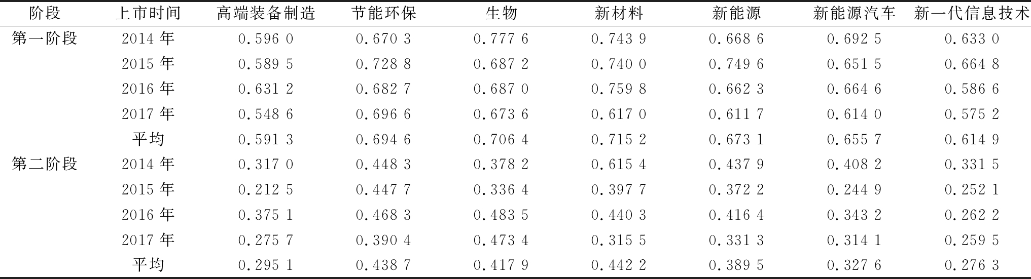 阶段上市时间高端装备制造节能环保生物新材料新能源新能源汽车新一代信息技术第一阶段2014年0.596 00.670 30.777 60.743 90.668 60.692 50.633 02015年0.589 50.728 80.687 20.740 00.749 60.651 50.664 82016年0.631 20.682 70.687 00.759 80.662 30.664 60.586 62017年0.548 60.696 60.673 60.617 00.611 70.614 00.575 2平均0.591 30.694 60.706 40.715 20.673 10.655 70.614 9第二阶段2014年0.317 00.448 30.378 20.615 40.437 90.408 20.331 52015年0.212 50.447 70.336 40.397 70.372 20.244 90.252 12016年0.375 10.468 30.483 50.440 30.416 40.343 20.262 22017年0.275 70.390 4 0.473 40.315 50.331 30.314 10.259 5平均0.295 10.438 70.417 90.442 20.389 50.327 60.276 3