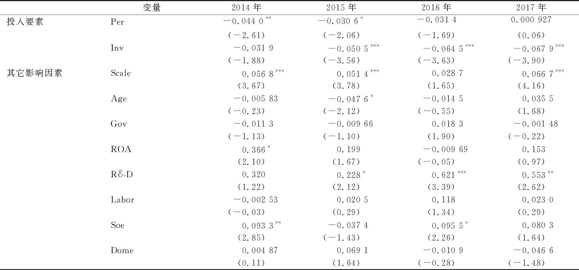 变量2014年2015年2016年2017年投入要素Per-0.044 0**-0.030 6*-0.031 40.000 927(-2.61)(-2.06)(-1.69)(0.06)Inv-0.031 9-0.050 5***-0.064 5***-0.067 9***(-1.88)(-3.56)(-3.63)(-3.90)其它影响因素Scale0.056 8***0.051 4***0.028 70.066 7***(3.67)(3.78)(1.65)(4.16)Age-0.005 83-0.047 6*-0.014 50.035 5(-0.23)(-2.12)(-0.55)(1.68)Gov-0.011 3-0.009 660.018 3-0.001 48(-1.13)(-1.10)(1.90)(-0.22)ROA0.366*0.199-0.009 690.153(2.10)(1.67)(-0.05)(0.97)R&D0.3200.228*0.621***0.553**(1.22)(2.12)(3.39)(2.62)Labor-0.002 530.020 50.1180.023 0(-0.03)(0.29)(1.34)(0.29)Soe0.093 3**-0.037 40.095 5*0.080 3(2.85)(-1.43)(2.26)(1.64)Dome0.004 870.069 1-0.010 9-0.046 6(0.11)(1.64)(-0.28)(-1.48)