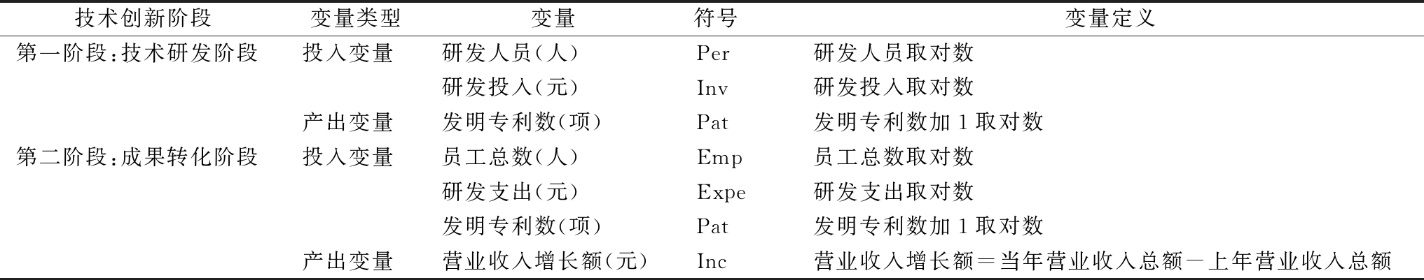 根据上述对战略性新兴产业技术创新的分析,本文构建测算企业两阶段创新效率的指标体系,如表1所示。