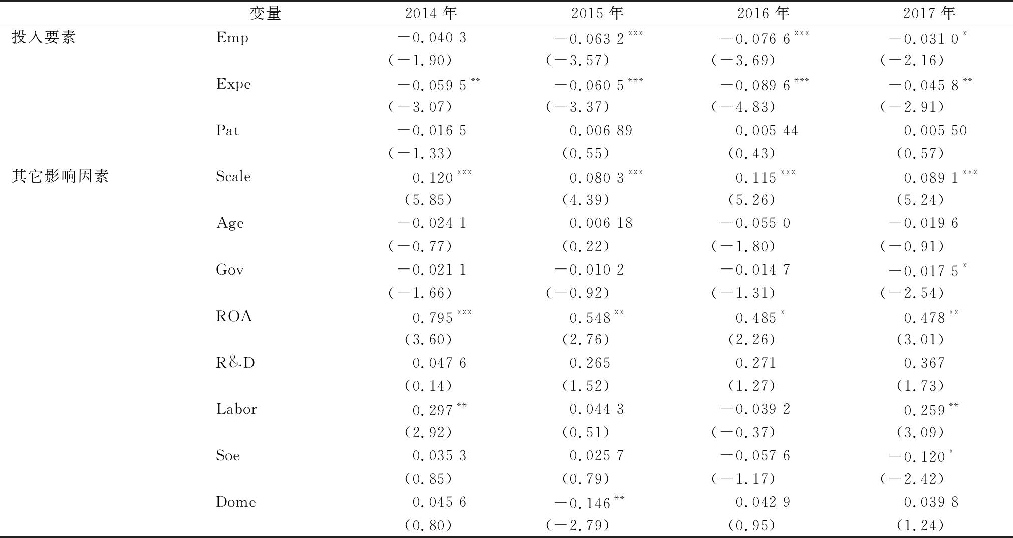 变量2014年2015年2016年2017年投入要素Emp-0.040 3-0.063 2***-0.076 6***-0.031 0*(-1.90)(-3.57)(-3.69)(-2.16)Expe-0.059 5**-0.060 5***-0.089 6***-0.045 8**(-3.07)(-3.37)(-4.83)(-2.91)Pat-0.016 50.006 890.005 440.005 50(-1.33)(0.55)(0.43)(0.57)其它影响因素Scale0.120***0.080 3***0.115***0.089 1***(5.85)(4.39)(5.26)(5.24)Age-0.024 10.006 18-0.055 0-0.019 6(-0.77)(0.22)(-1.80)(-0.91)Gov-0.021 1-0.010 2-0.014 7-0.017 5*(-1.66)(-0.92)(-1.31)(-2.54)ROA0.795***0.548**0.485*0.478**(3.60)(2.76)(2.26)(3.01)R&D0.047 60.2650.2710.367(0.14)(1.52)(1.27)(1.73)Labor0.297**0.044 3-0.039 20.259**(2.92)(0.51)(-0.37)(3.09)Soe0.035 30.025 7-0.057 6-0.120*(0.85)(0.79)(-1.17)(-2.42)Dome0.045 6-0.146**0.042 90.039 8(0.80)(-2.79)(0.95)(1.24)