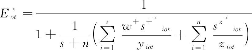 整体效率是每期效率的加权平均数,每期效率可以通过最终产出和中间产出的松弛变量得出。由于效率值是介于0~1之间的比率,因此使用倒数定义效率,当松弛变量为0时,效率值是1。计算以上模型的最优解,得到每期效率![]()