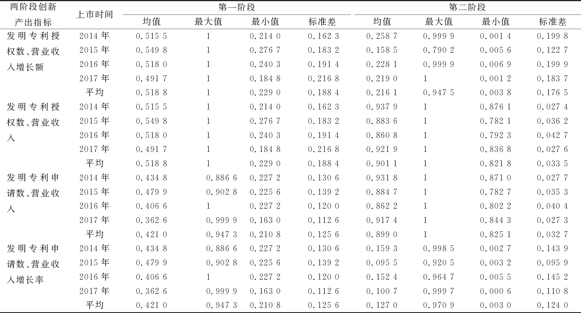 两阶段创新产出指标上市时间第一阶段均值最大值最小值标准差第二阶段均值最大值最小值标准差发明专利授权数、营业收入增长额2014年0.515 510.214 00.162 30.258 70.999 90.001 40.199 82015年0.549 810.276 70.183 20.158 50.790 20.005 60.122 72016年0.518 010.240 30.191 40.228 10.999 90.006 90.199 92017年0.491 710.184 80.216 80.219 010.001 20.183 7平均0.518 810.229 00.188 40.216 10.947 50.003 80.176 5发明专利授权数、营业收入2014年0.515 510.214 00.162 30.937 910.876 10.027 42015年0.549 810.276 70.183 20.883 610.782 10.036 22016年0.518 010.240 30.191 40.860 810.792 30.042 72017年0.491 710.184 80.216 80.921 910.836 80.027 6平均0.518 810.229 00.188 40.901 110.821 80.033 5发明专利申请数、营业收入2014年0.434 80.886 60.227 20.130 60.931 810.871 00.027 72015年0.479 90.902 80.225 60.139 20.884 710.782 70.035 32016年0.406 610.227 20.120 00.862 210.802 20.040 42017年0.362 60.999 90.163 00.112 60.917 410.844 30.027 3平均0.421 00.947 30.210 80.125 60.899 010.825 10.032 7发明专利申请数、营业收入增长率2014年0.434 80.886 60.227 20.130 60.159 30.998 50.002 70.143 92015年0.479 90.902 80.225 60.139 20.095 50.920 50.003 20.095 92016年0.406 610.227 20.120 00.152 40.964 70.005 50.145 22017年0.362 60.999 90.163 00.112 60.100 70.999 70.000 60.110 8平均0.421 00.947 30.210 80.125 60.127 00.970 90.003 00.124 0