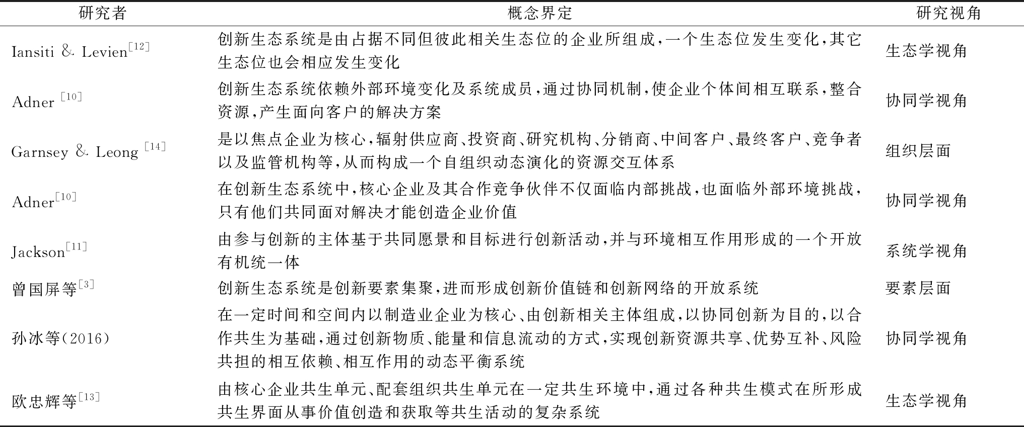 自2004年创新生态系统概念被首次提出后,众多学者基于不同视角对创新生态系统进行了界定(见表1)。其中,较为经典的是Adner[10]于2006年提出的创新生态系统内涵。他指出,创新生态系统中企业利用协作效应将各自产品组合成一致的、面向客户的解决方案,从而为客户带来任何单个企业都无法单独实现的价值;Jackson[11]从系统学视角将创新生态系统界定为由参与创新的主体基于共同愿景进行创新活动,并与环境相互作用形成的有机统一体。此外,一些学者从创新网络视角、生态学视角[12-13],组织层面[14]、要素层面[3]对创新生态系统加以定义。已有文献对创新生态系统的多种视角界定如表1所示。