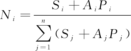 (4)生态位(Ecological niche):生物单元在生态系统中与环境相互作用过程中形成的相对地位与作用,即态与势两部分。参考已有文献,本文中创新生态位是指创新主体在创新生态系统中通过自身努力所获得的与其它创新主体之间的相对位置关系,用于表征其技术创新领域跨度和范围[21],计算方式见式(4)。其中,Ni表示第i个节点的生态位,设系统中有n个节点,i,j=1,2,…,n, Ni为生物单元i的生态位,Si为生物单元i的态,Pi为生物单元i的势,Sj为生物单元j的态,Pj为生物单元j的势,Ai和Aj为量纲转换系数。